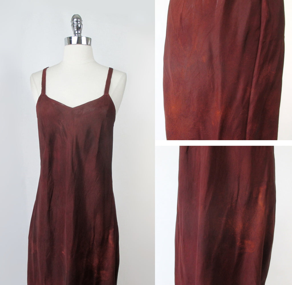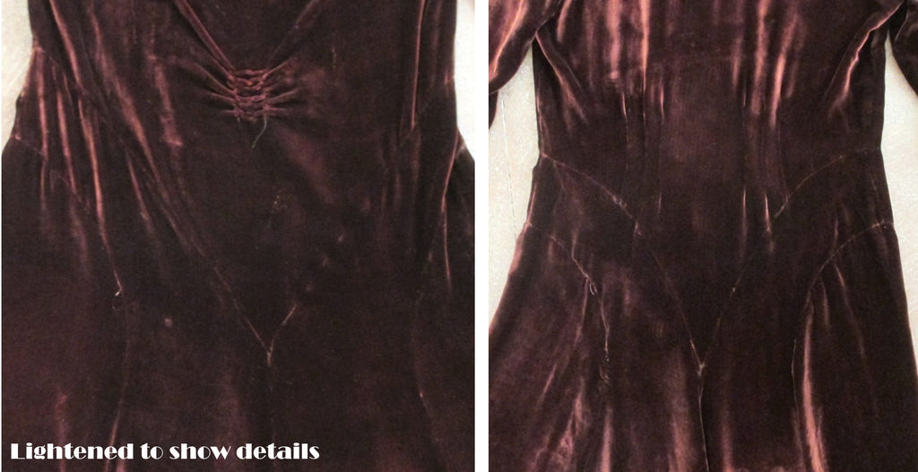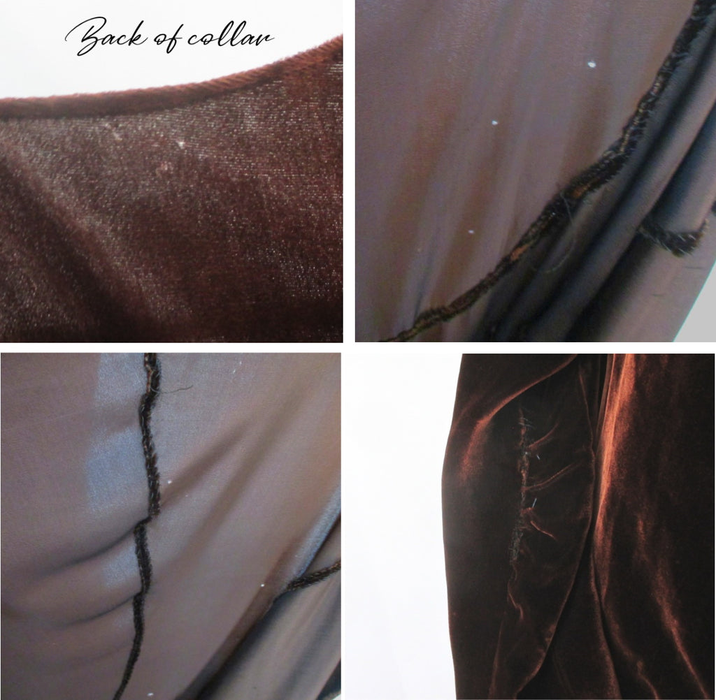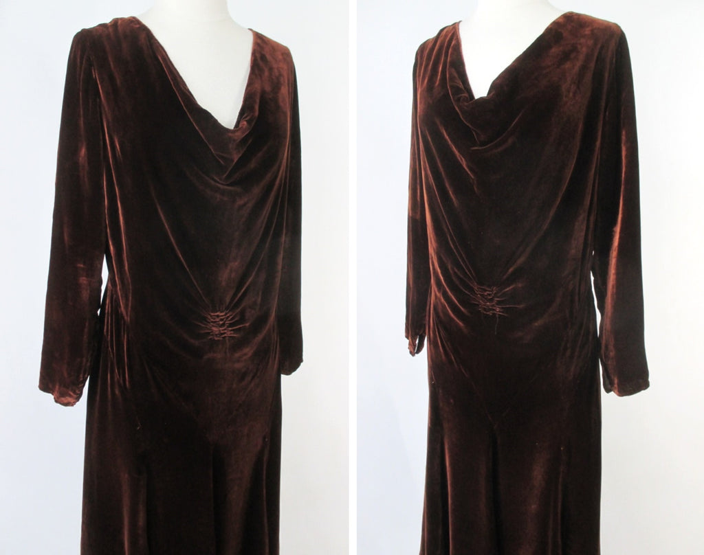 A vintage dress from the late 1920's to 1930's in a brown velvet with a copper sheen.