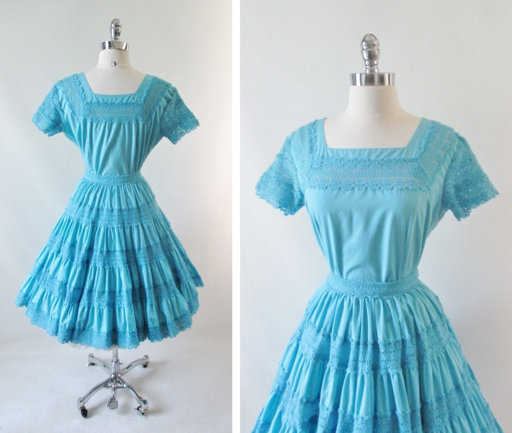 Vintage 50's Aquamarine Desert Flower Patio / Squaw Skirt Blouse Set L