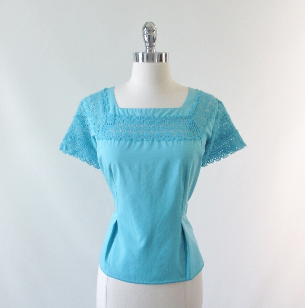 Blouse festures sheer, crochet sleeves and matching trim