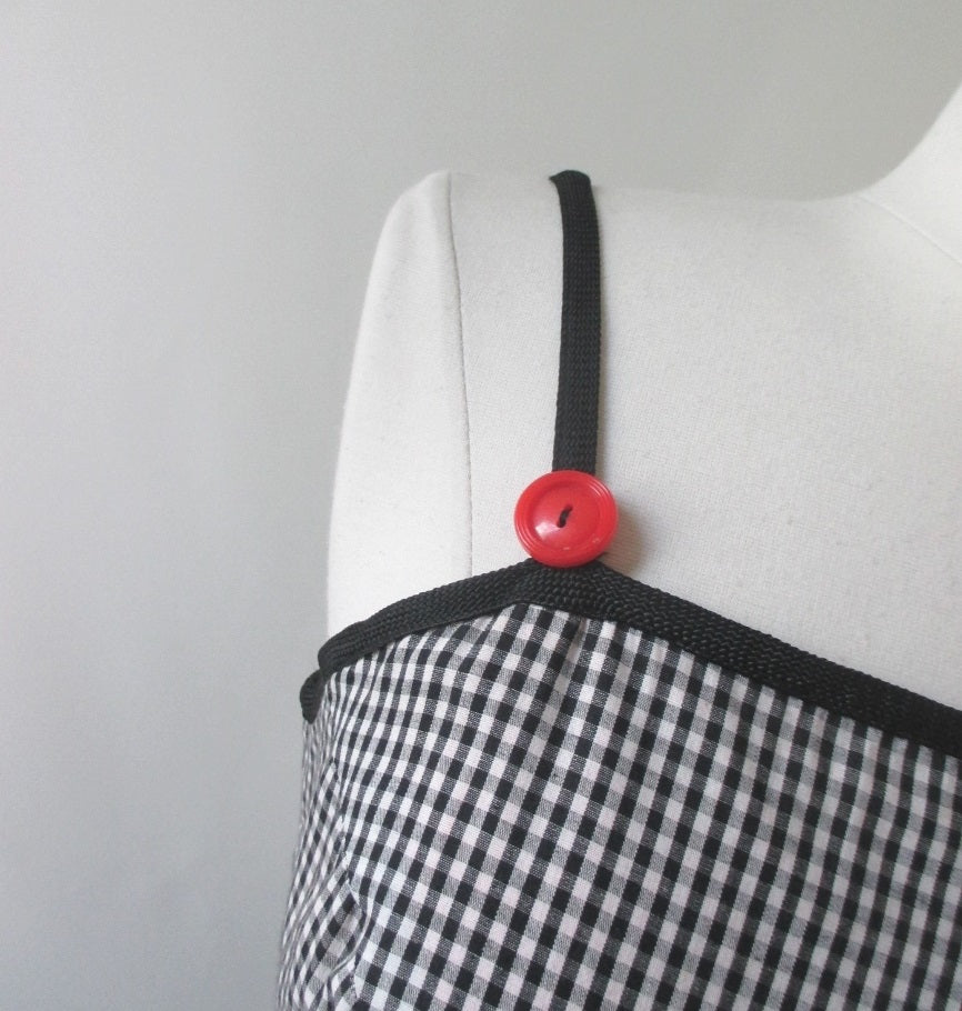 The dress features thin black shoulder straps and red buttons