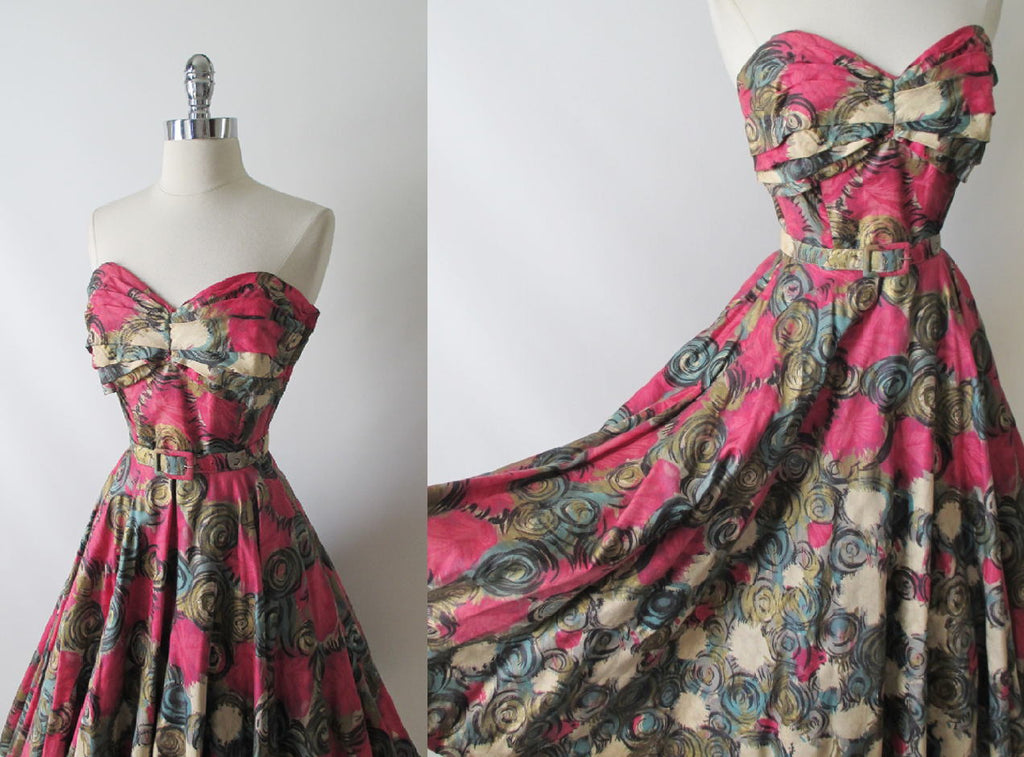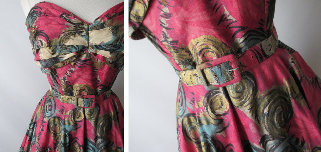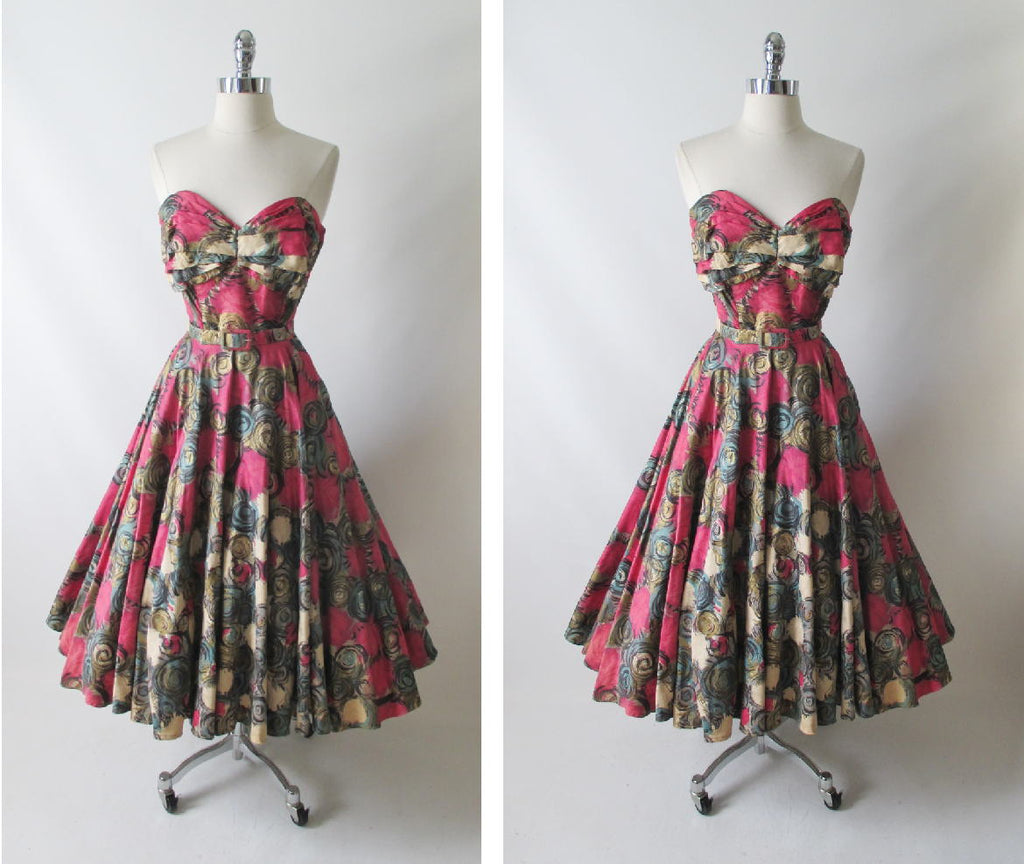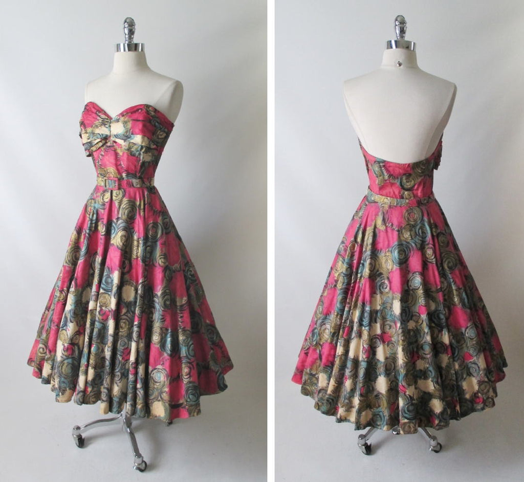 Vintage 50's Handpainted Gold Pink Flower Strapless Full Circle Skirt Dress S