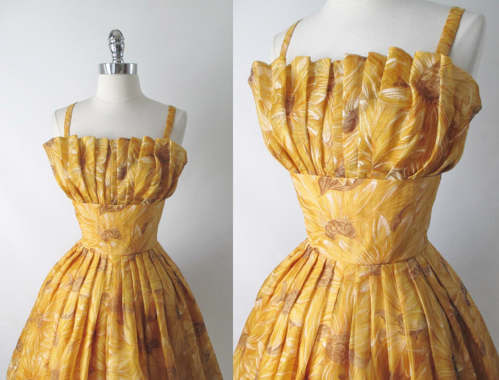 Vintage 60's / 50's Golden Flower Full Skirt Party Dress S