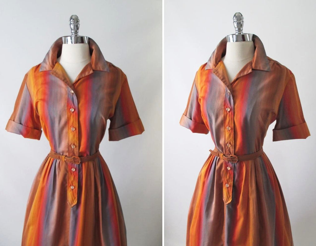 Vintage 60's 50's Ombre Stripe Shirtwaist Full Skirt Day Dress M