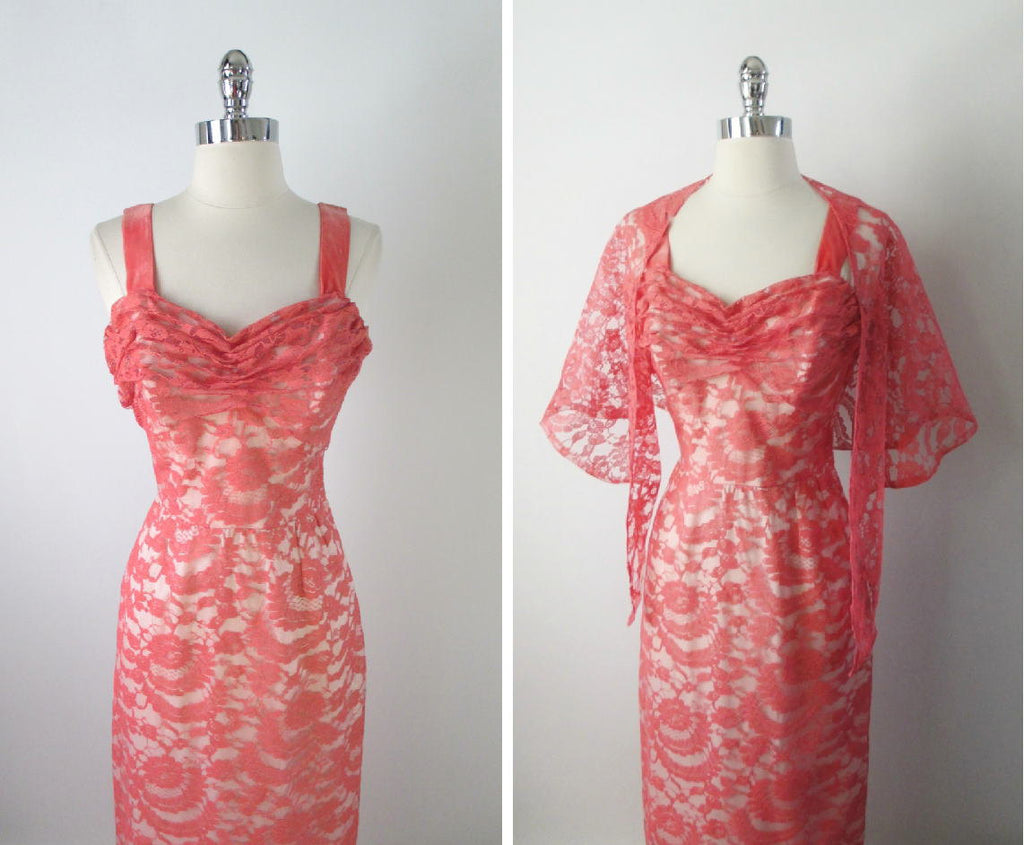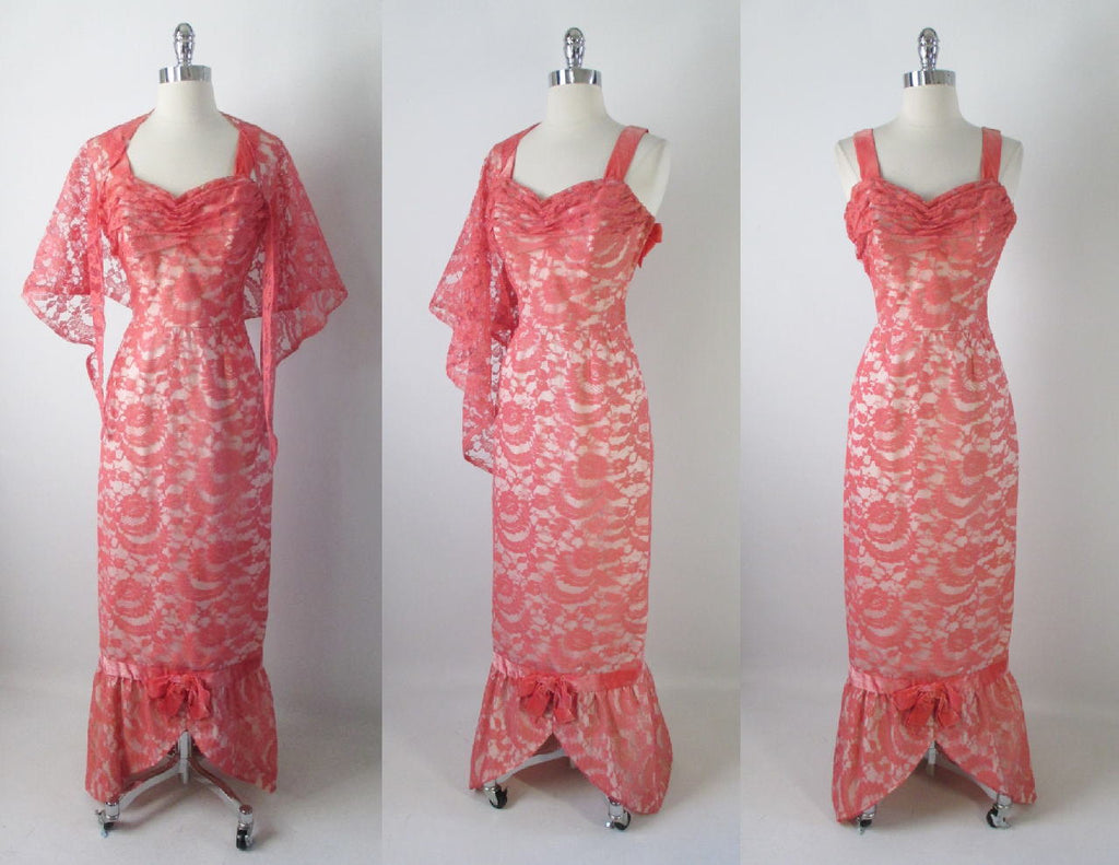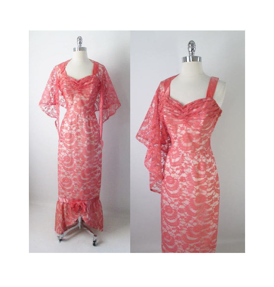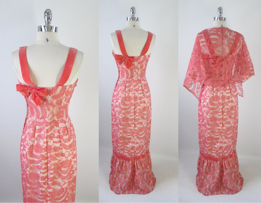 Vintage 50's Pink Lace Mermaid Hem Party Dress & Wrap Gown S