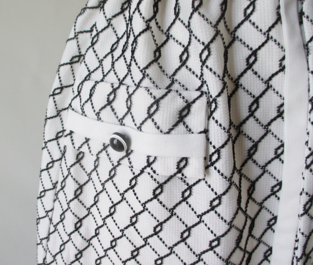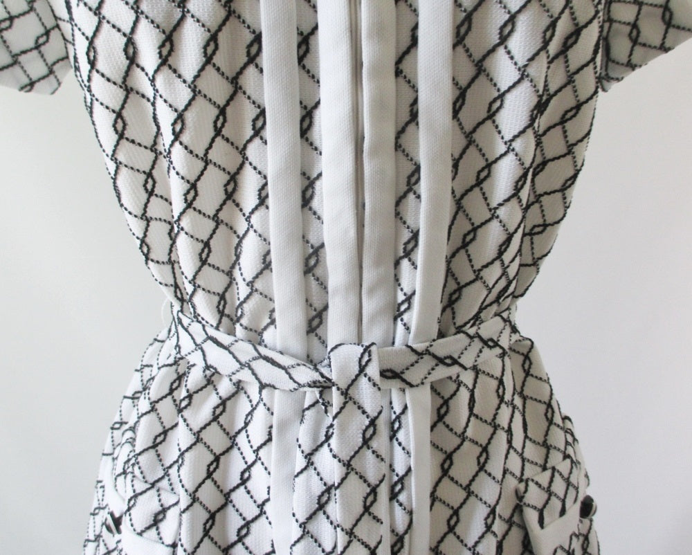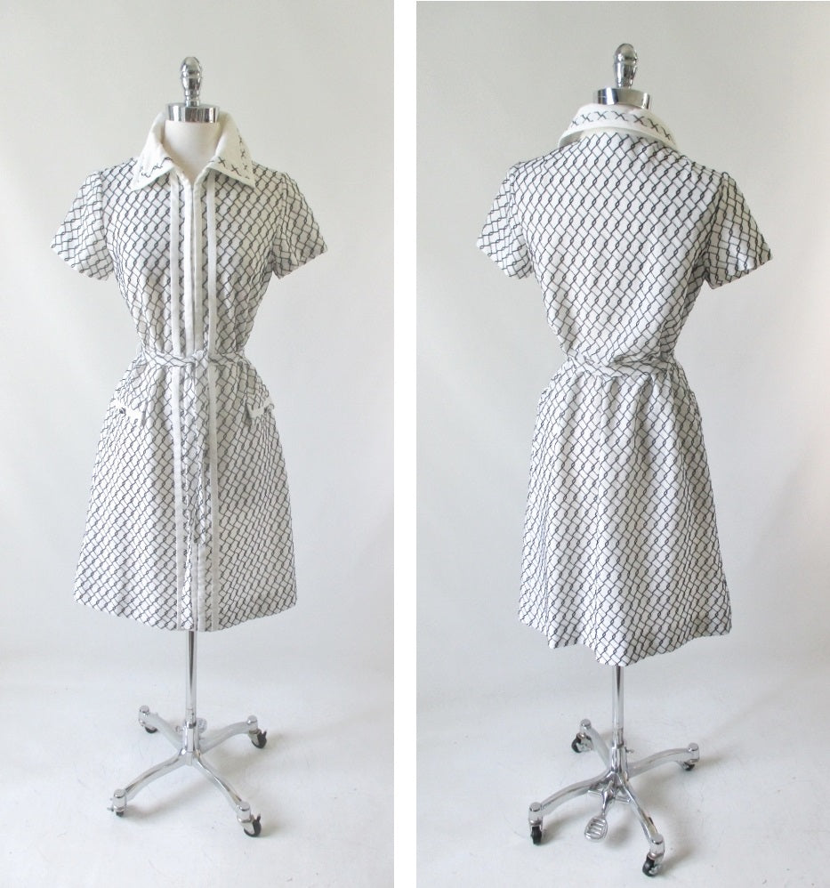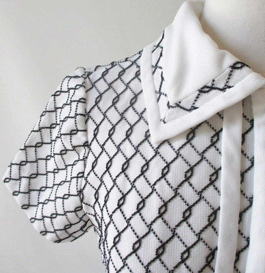 Short sleeves, matching trim collar and 2 rows of white fabric down the length.