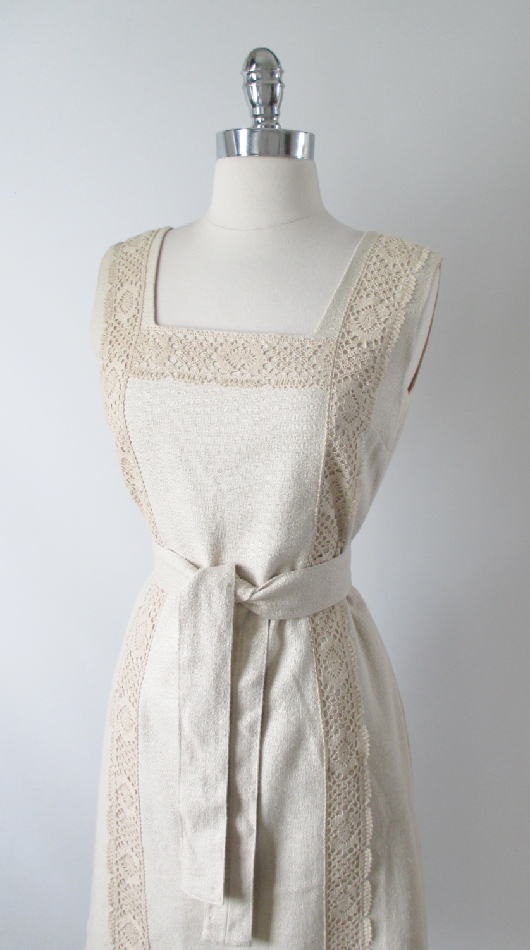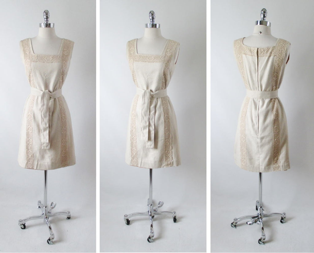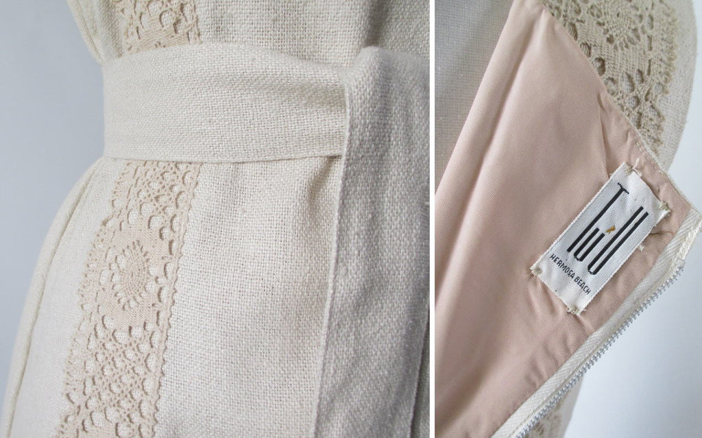 Vintage 60's Natural Tan & Lace Shift Dress Matching Belt S
