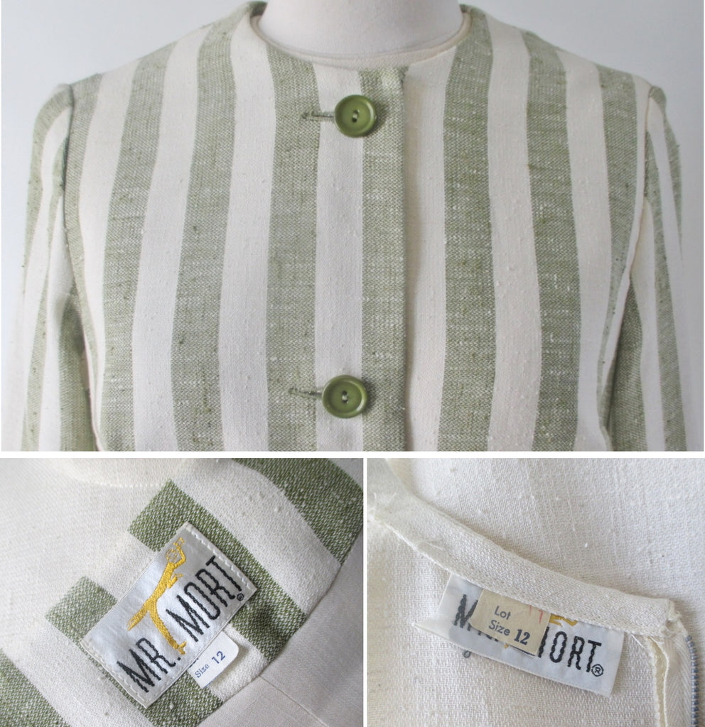 Vintage 60's Sheath Dress Matching Green Stripe Jacket Set L