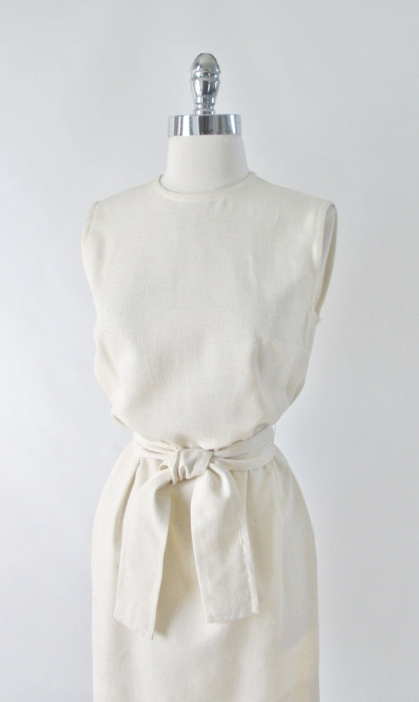 Cream, sleeveless dress with wide matching fabric belt