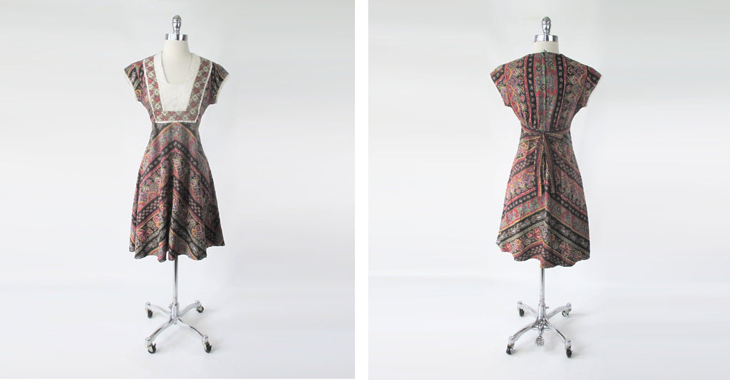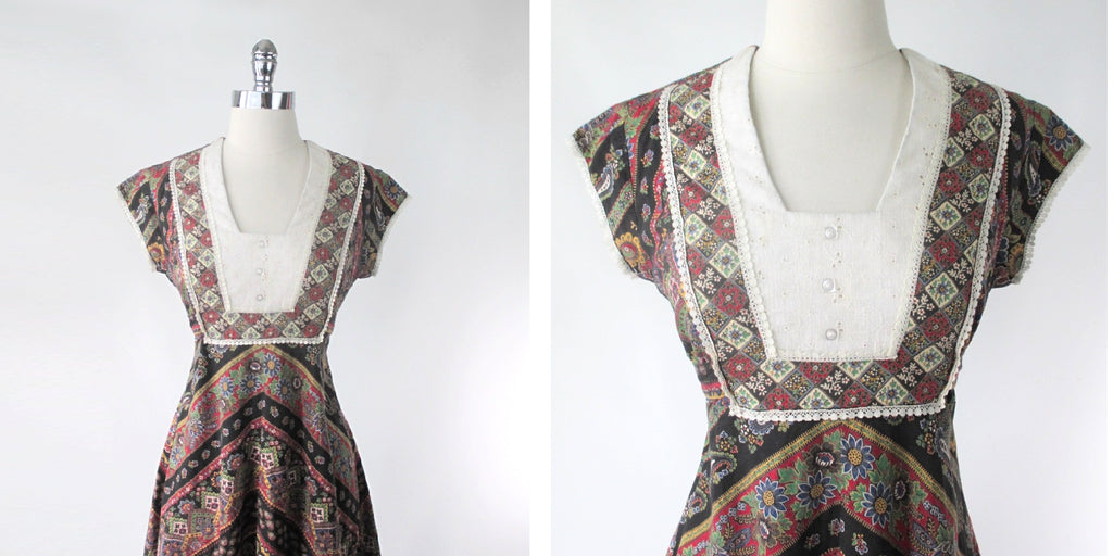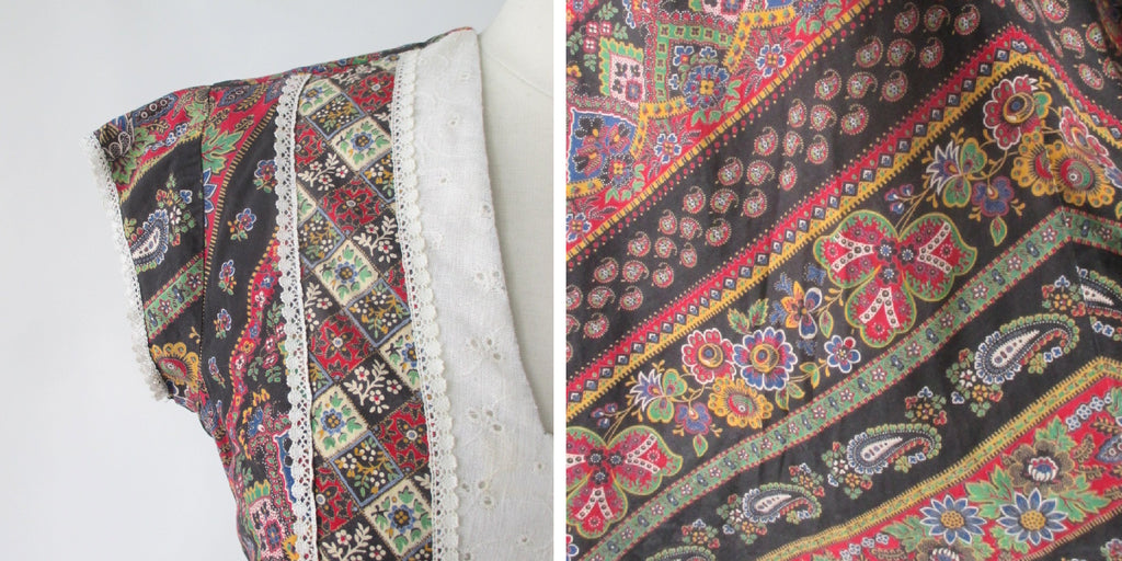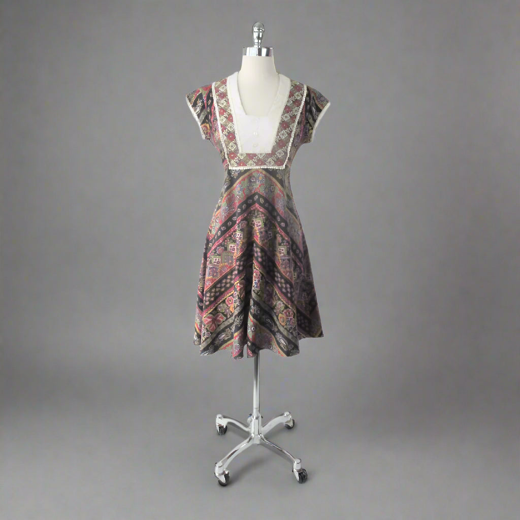 Vintage 70s Bohemian Paisley Eyelet Midi Dress S