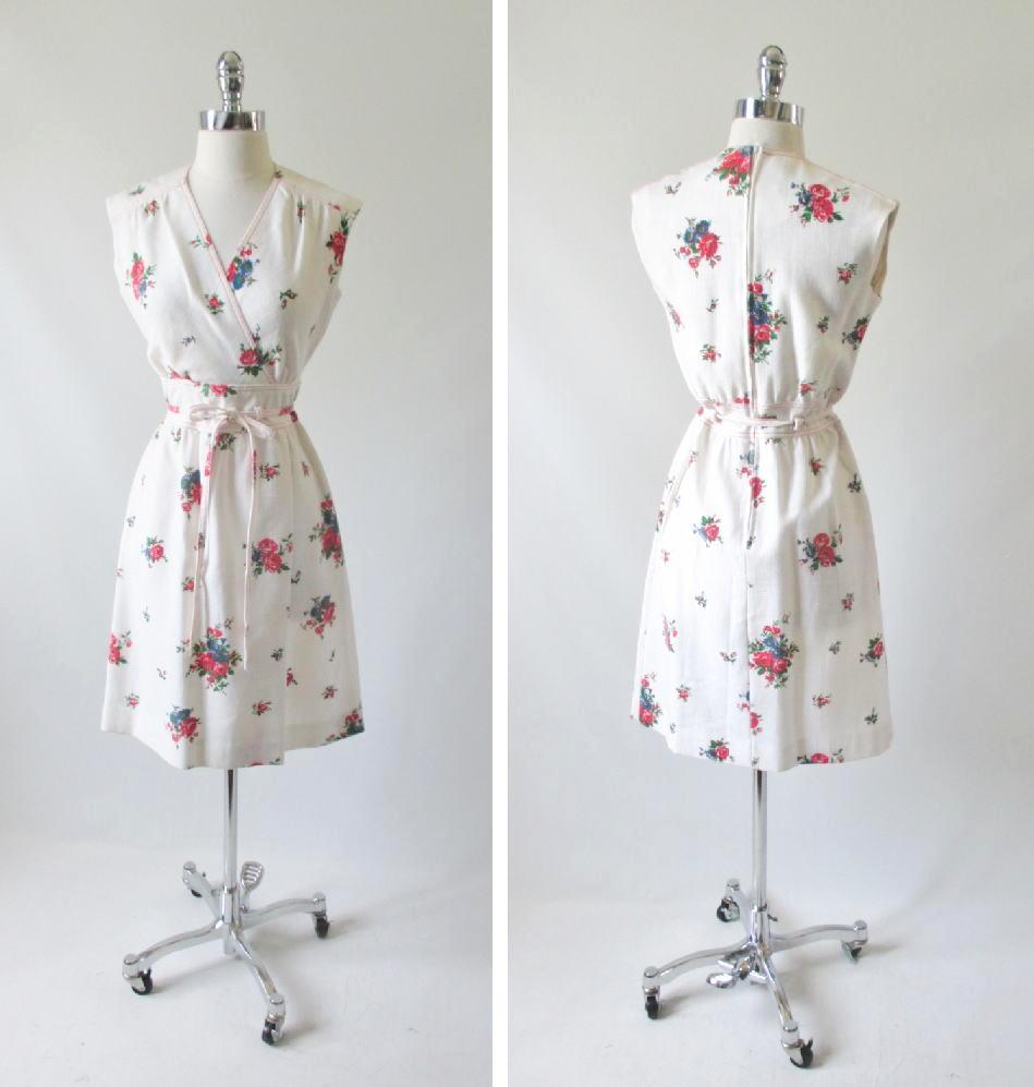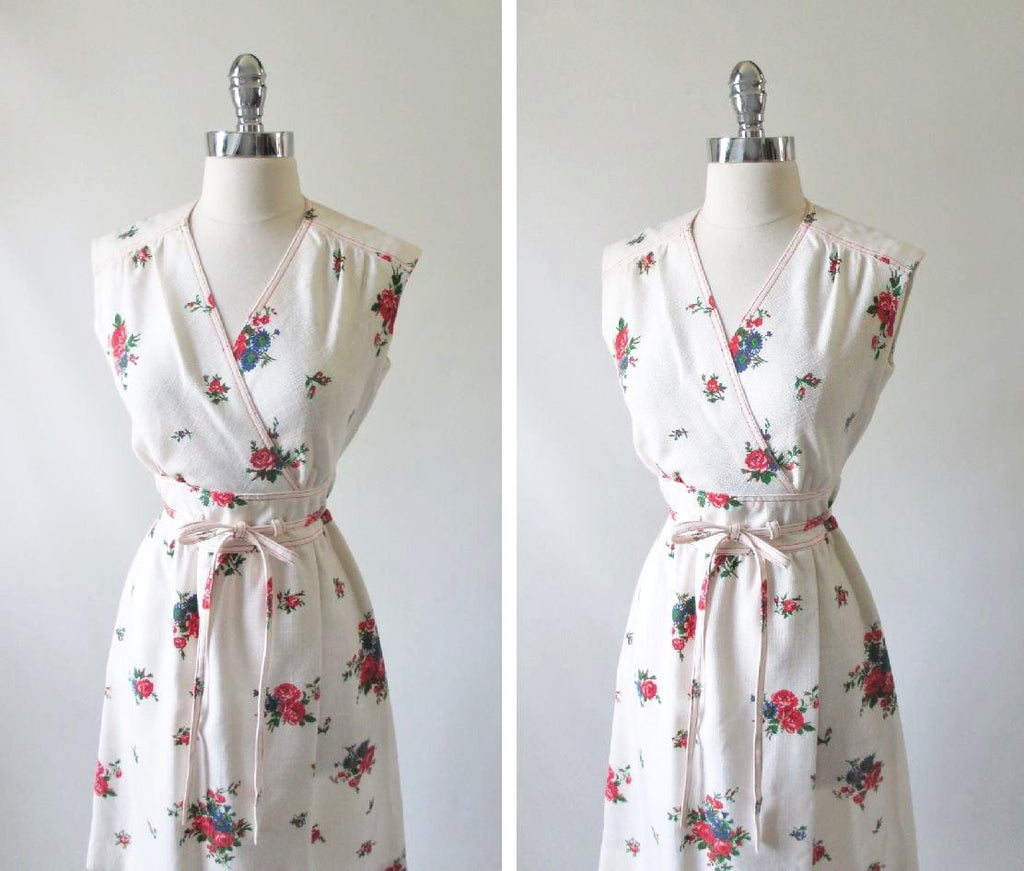 Vintage 70's Natural Cotton Red Blue Flower Day Dress M