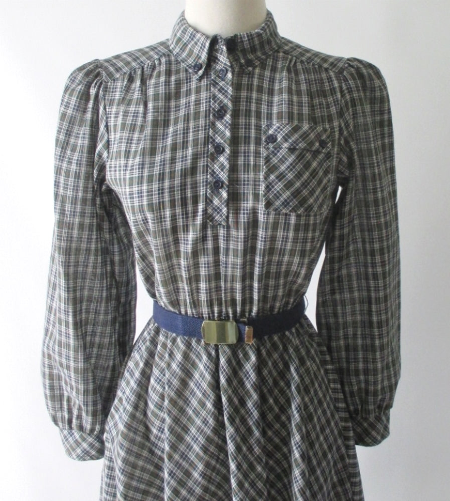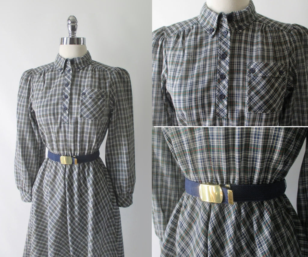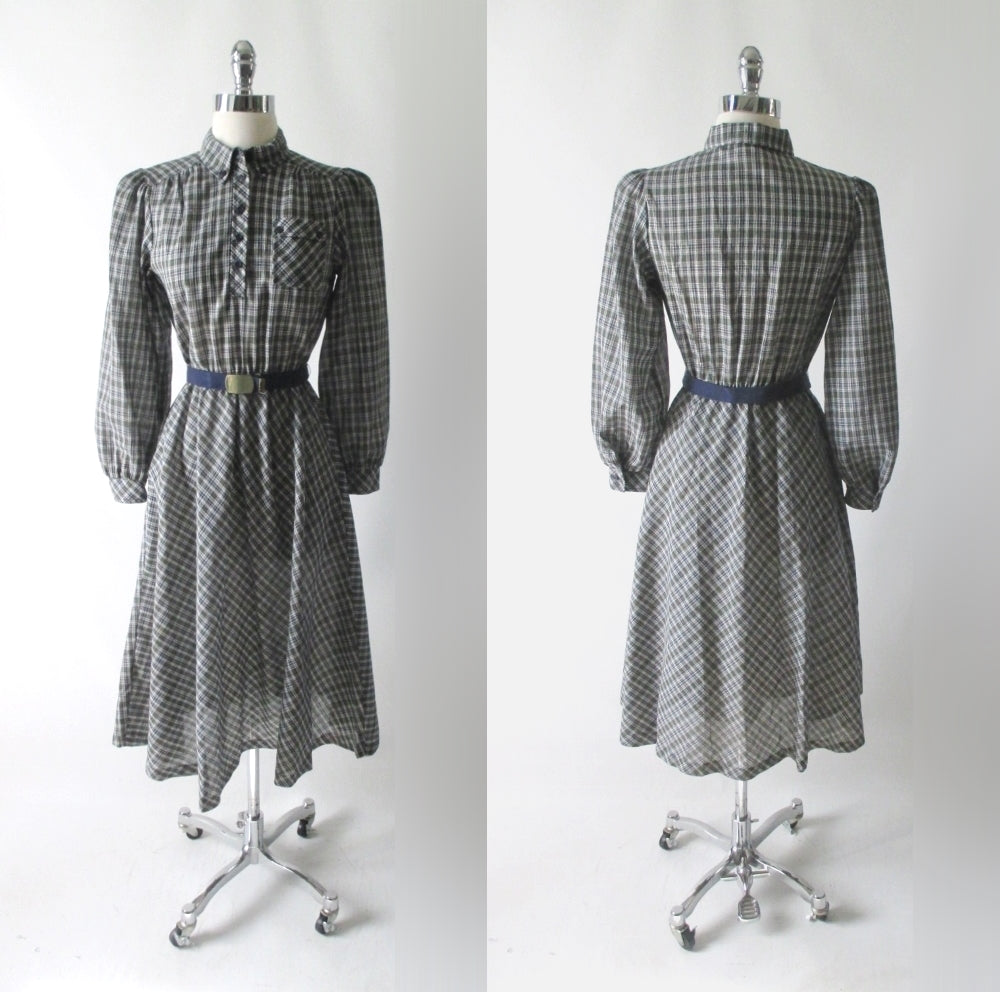 Vintage 70s Preppy Tartan Plaid Full Skirt Day Dress S