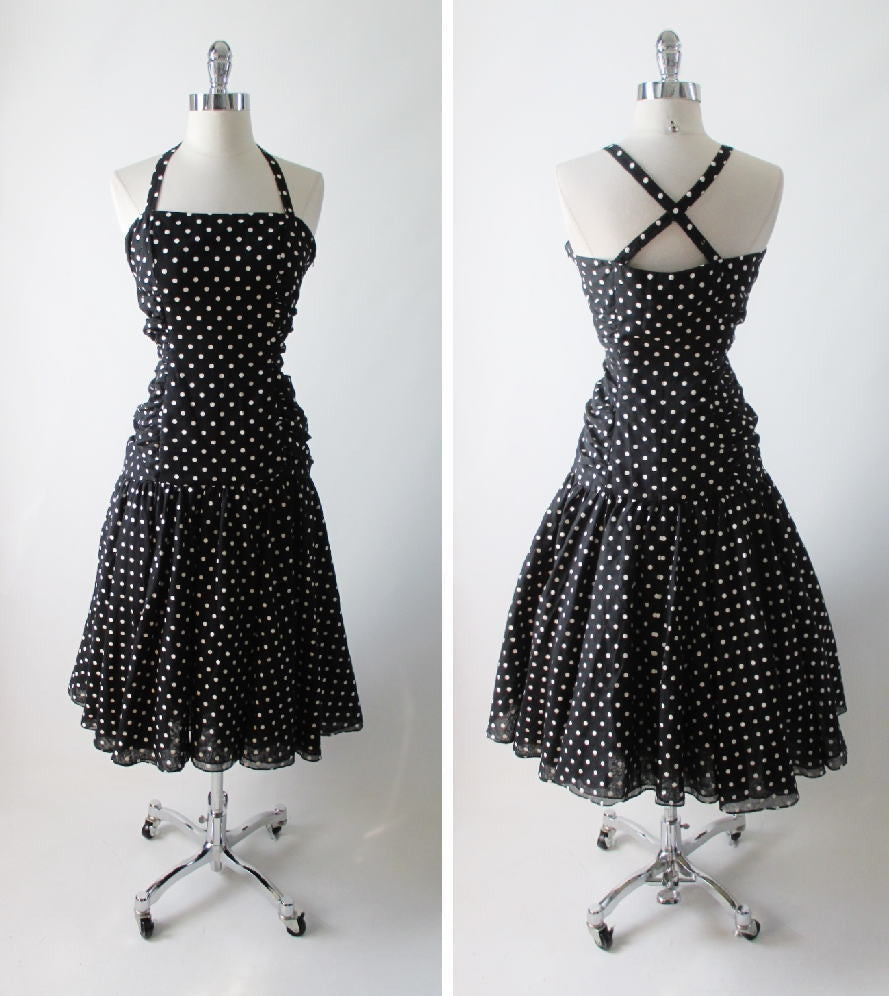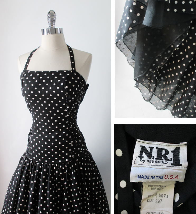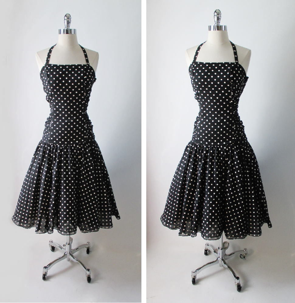Vintage 50's Inspired 80's Black White Polka Dot Full Skirt Halter Dress M