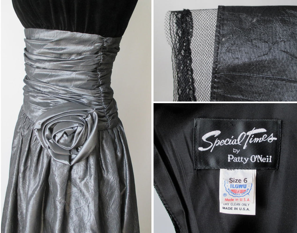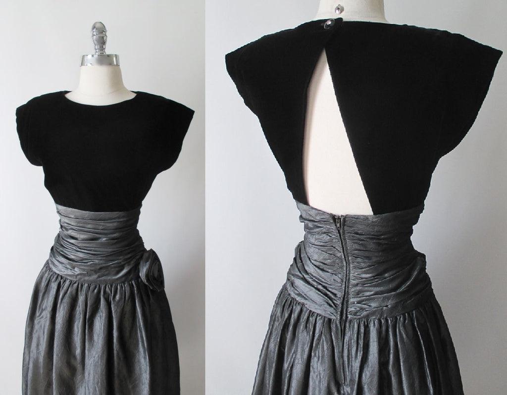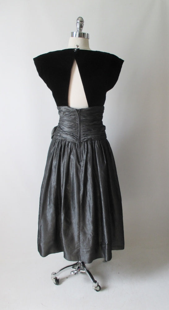 Vintage 80's Black Velvet Silver Taffeta Rosette Party Dress M