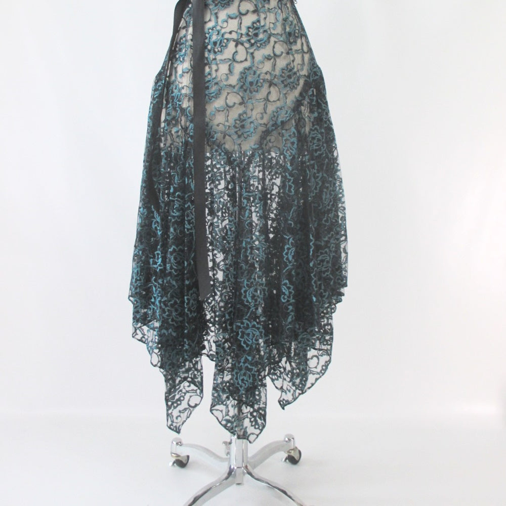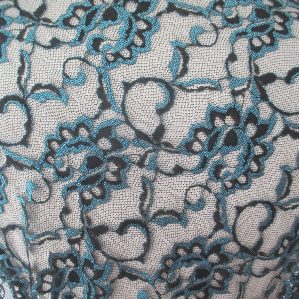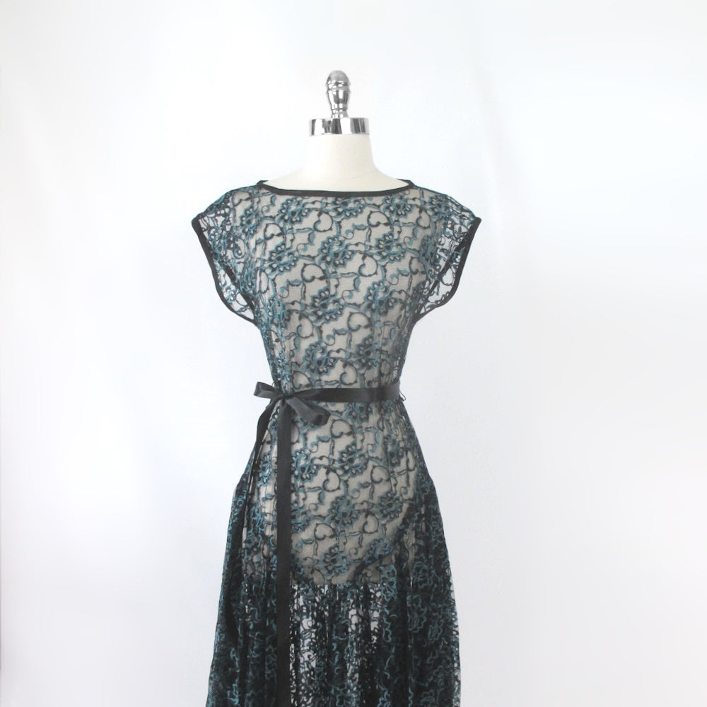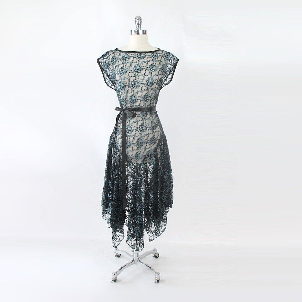 Vintage 80s Sheer Blue & Black Lace Dress S