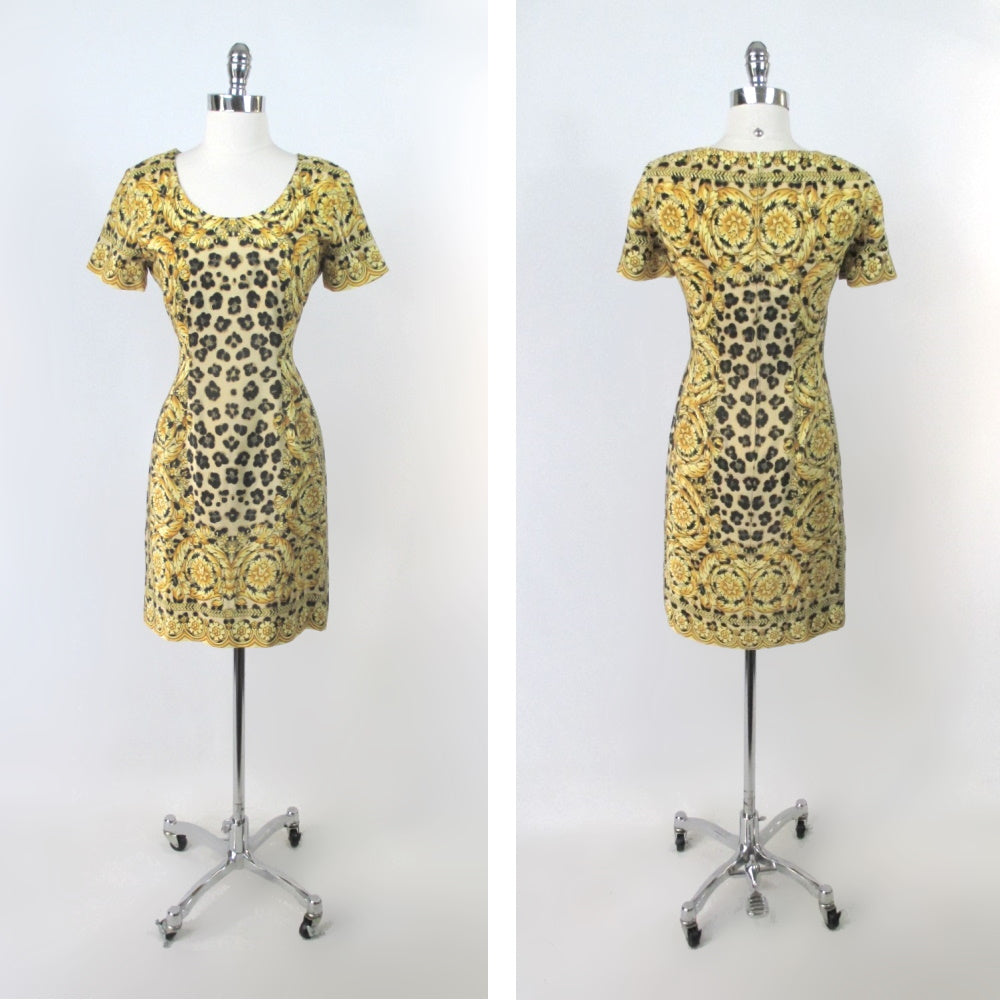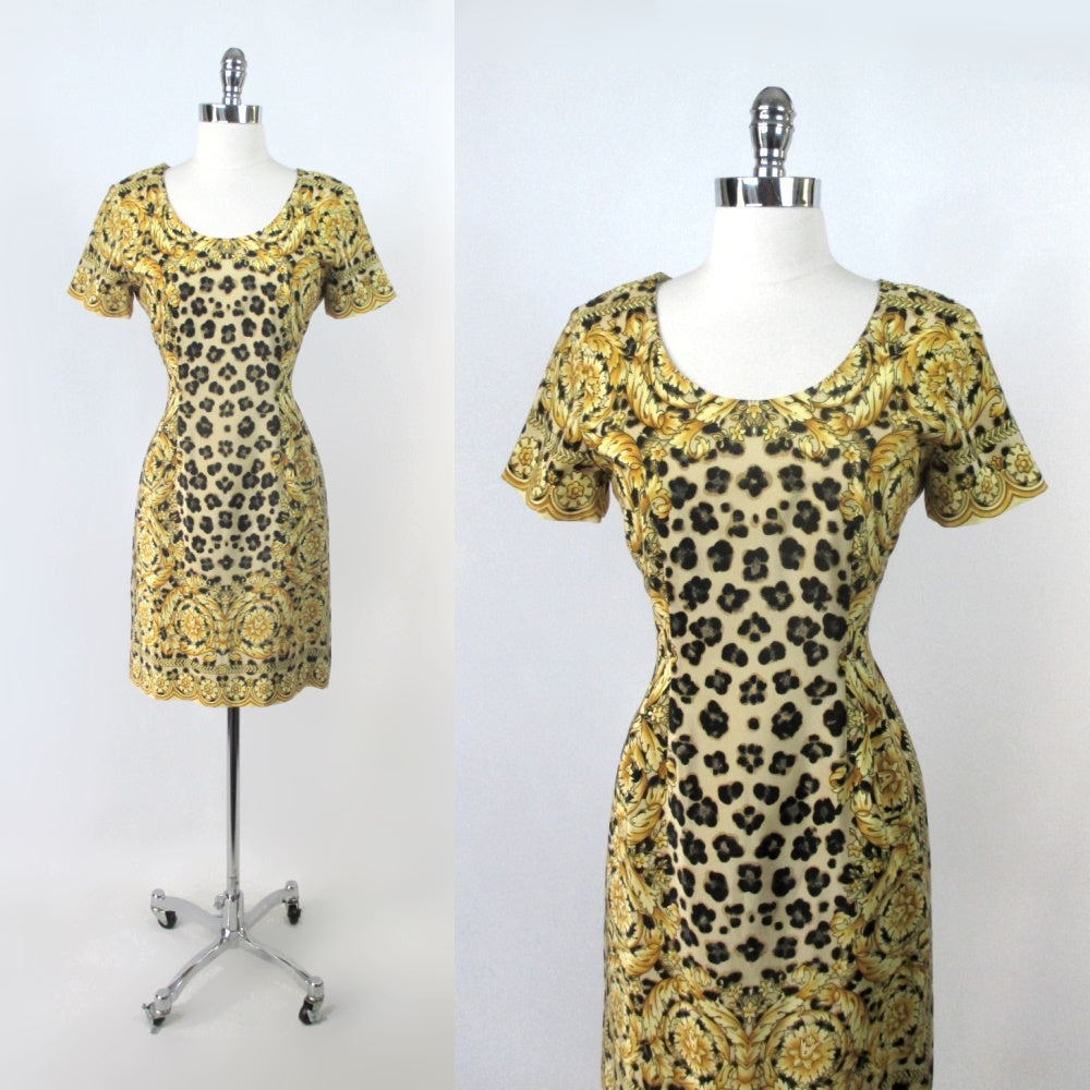 Vintage 90s Silk Baroque Scarf Leopard Dress S