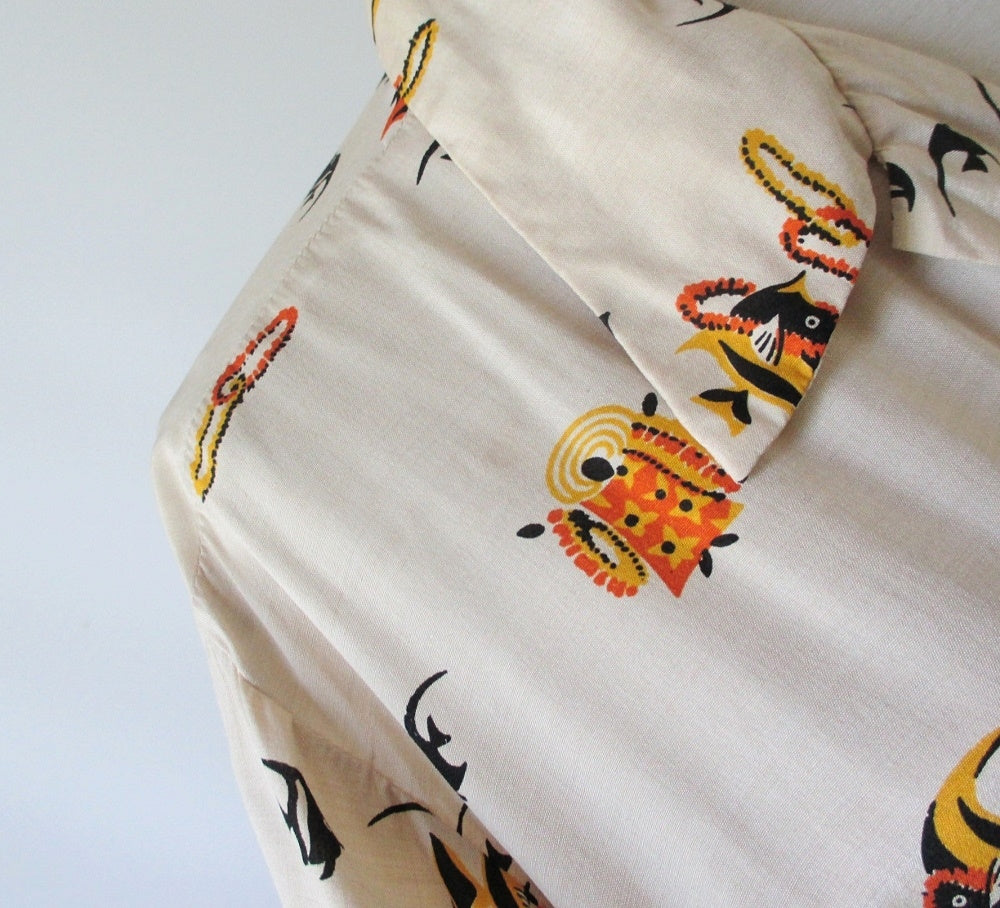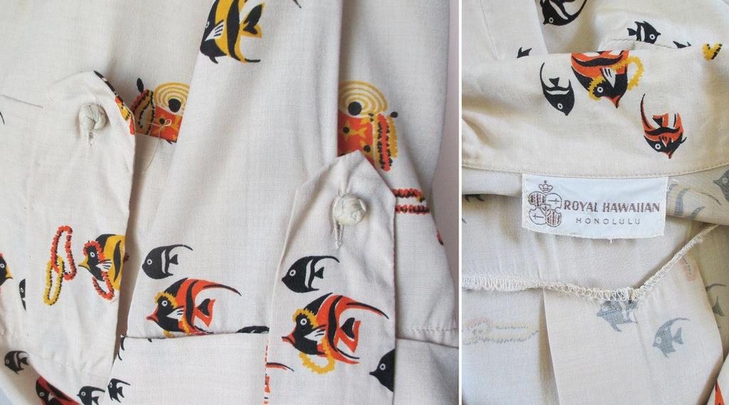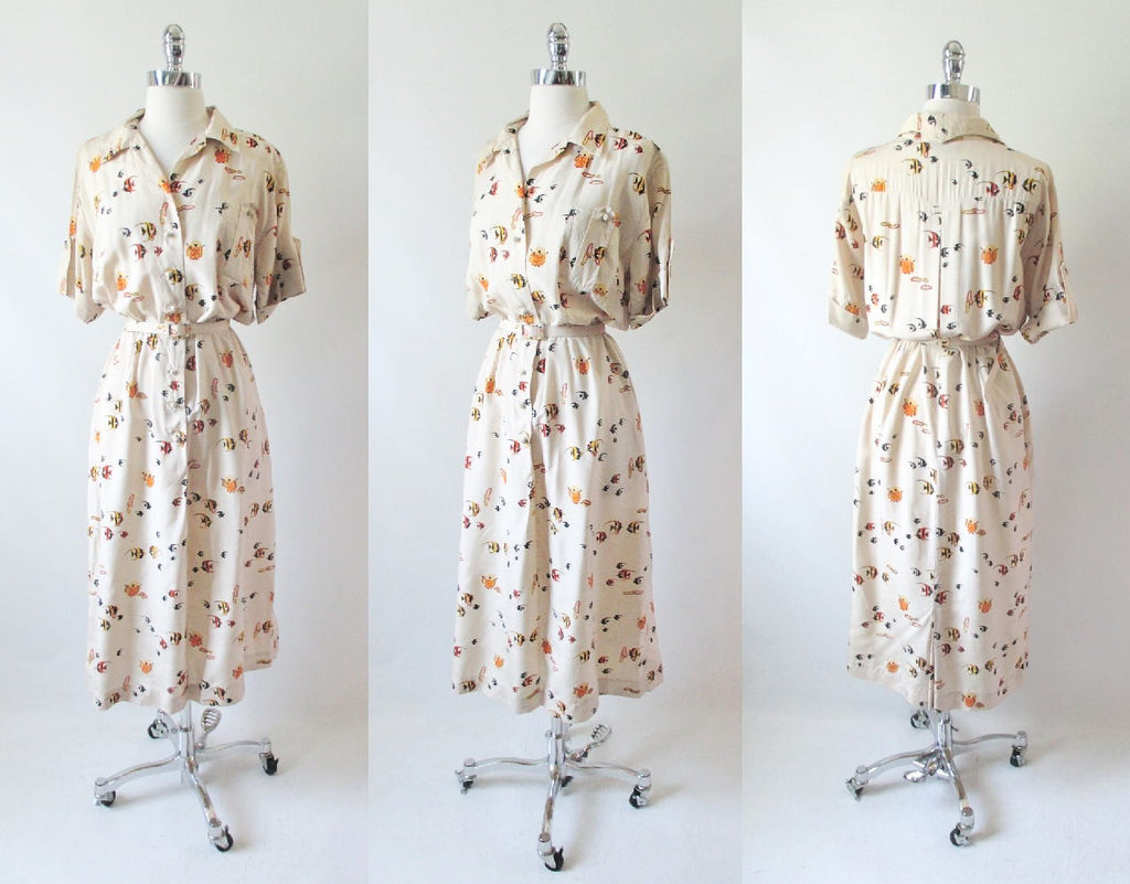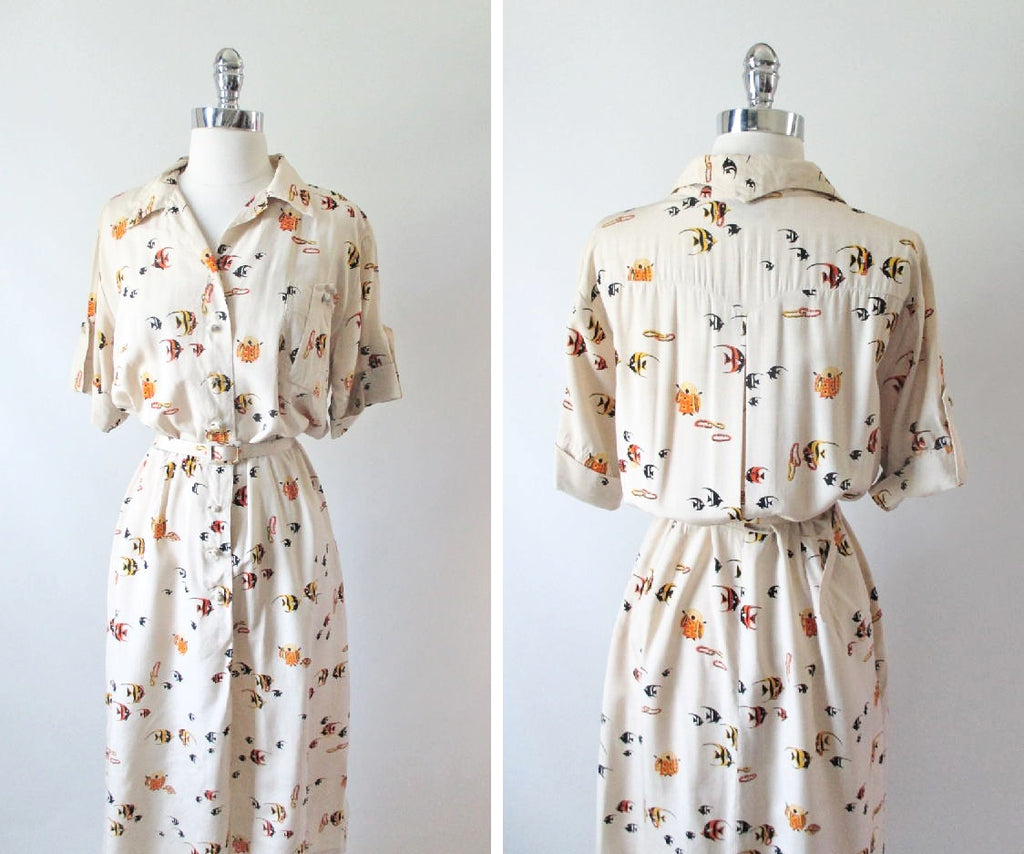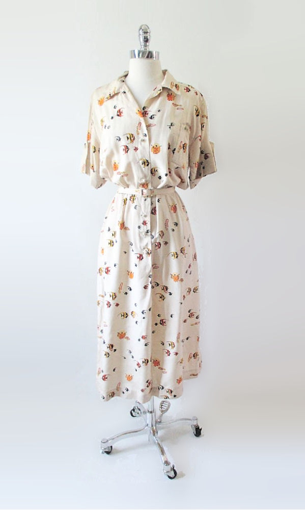 Rare Vintage 40's Silk Angelfish Novelty Print Hawaiian Dress L