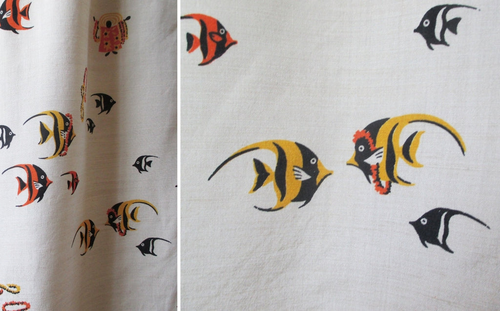 A unique vintage Hawaiian dress in silk with an amazing angelfish print, with leis