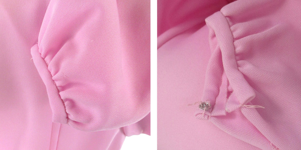Bubblegum pink with rounded neckline and full length, bishop sleeves.