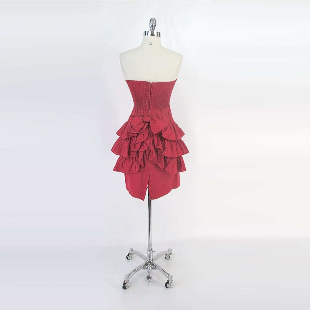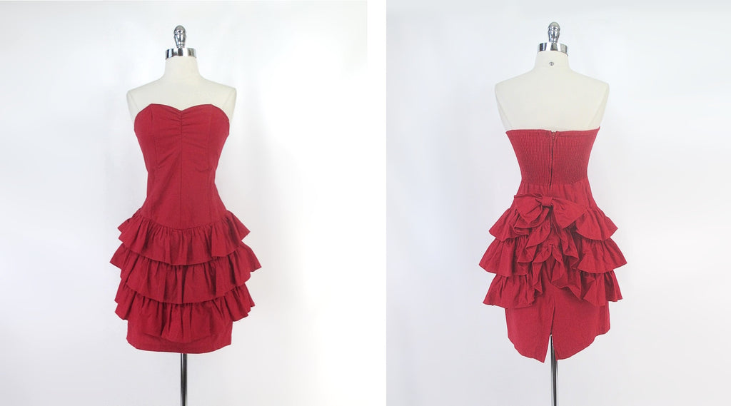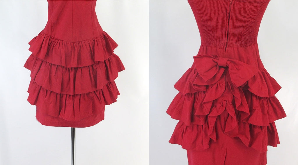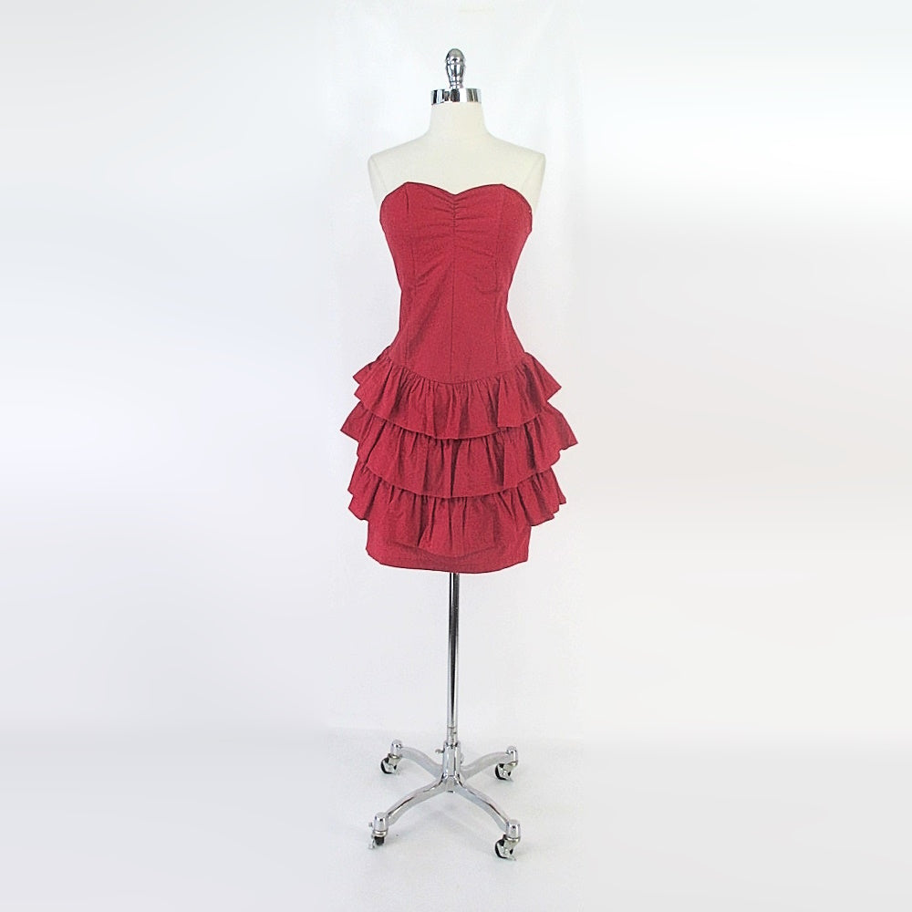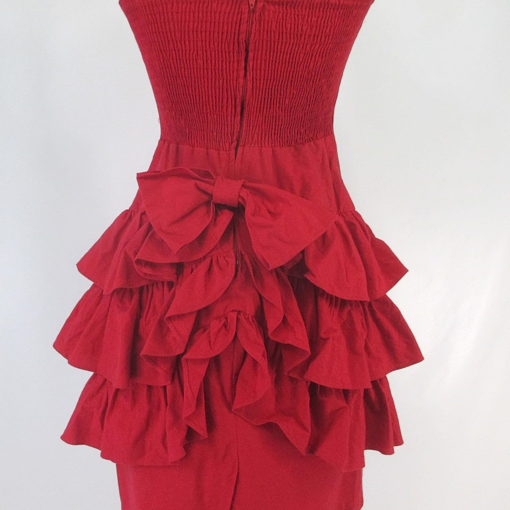 Vintage 80s Red Strapless Ruffle Skirt Mini Party Dress S