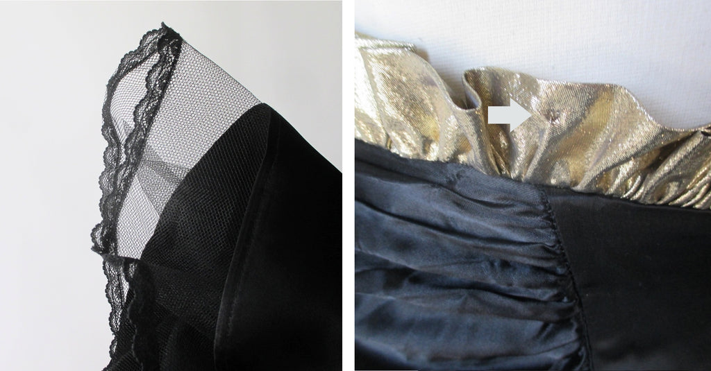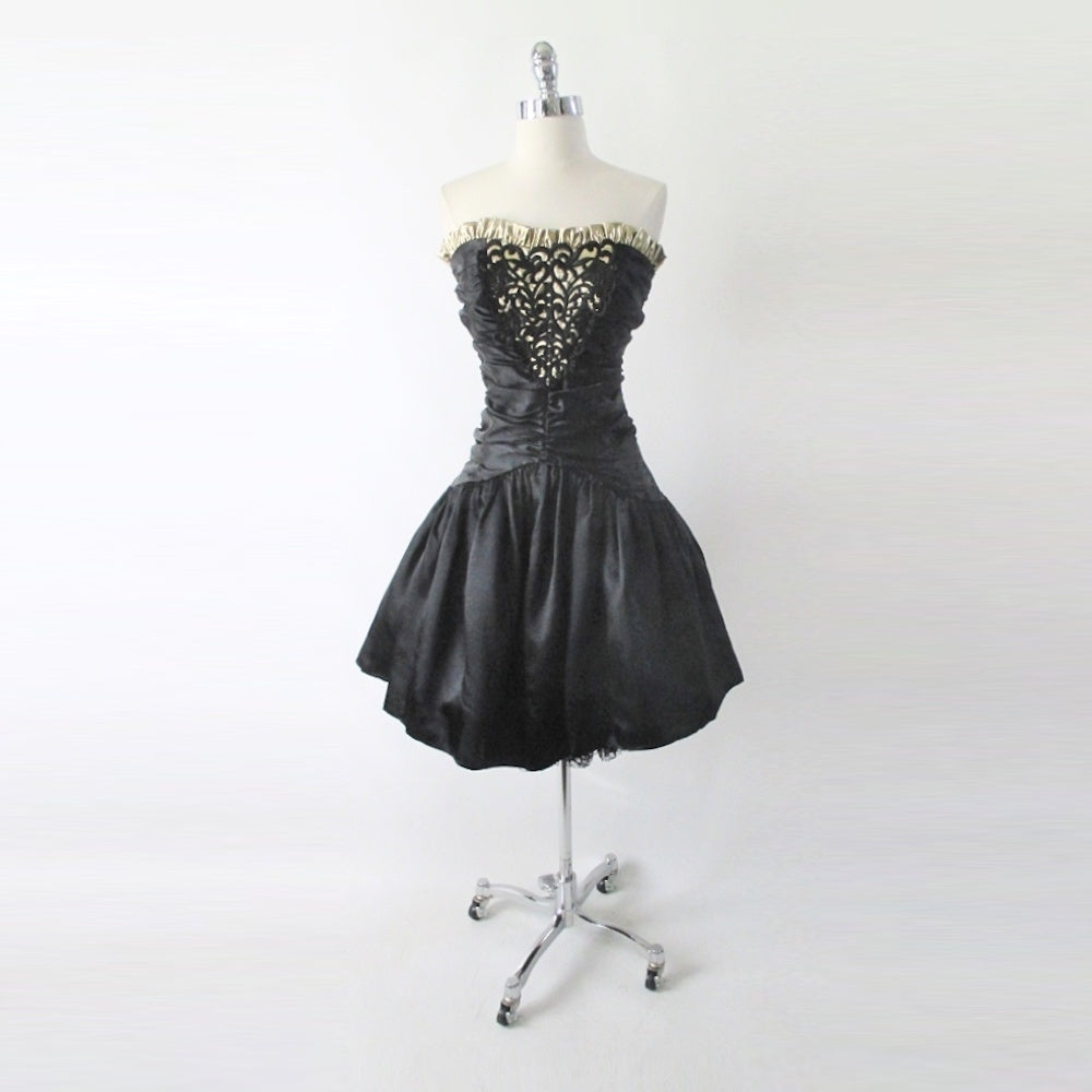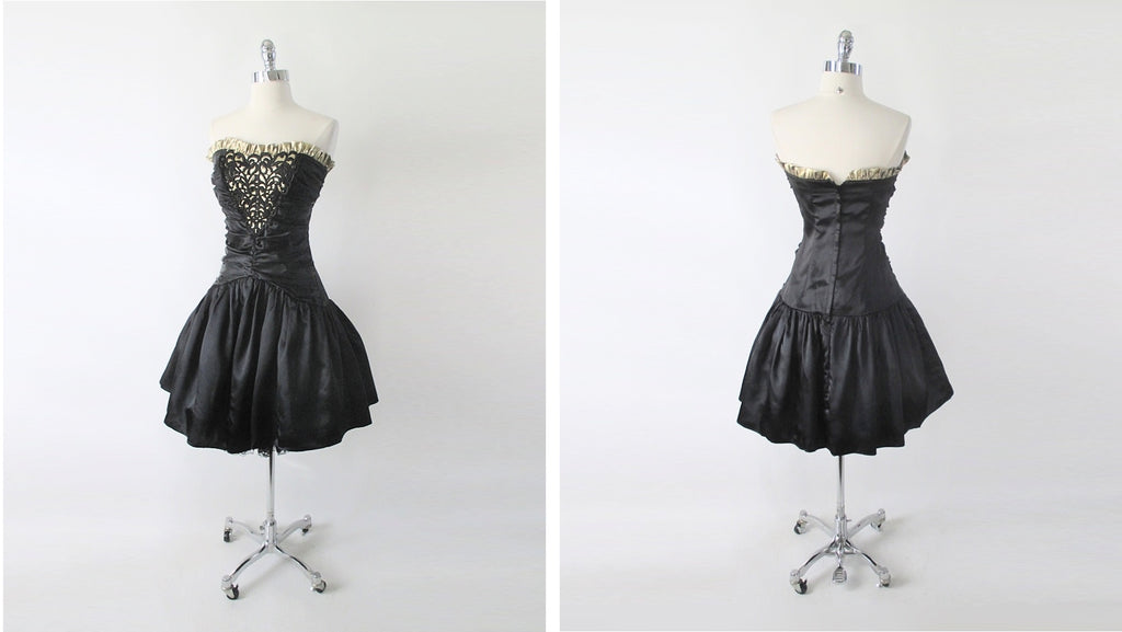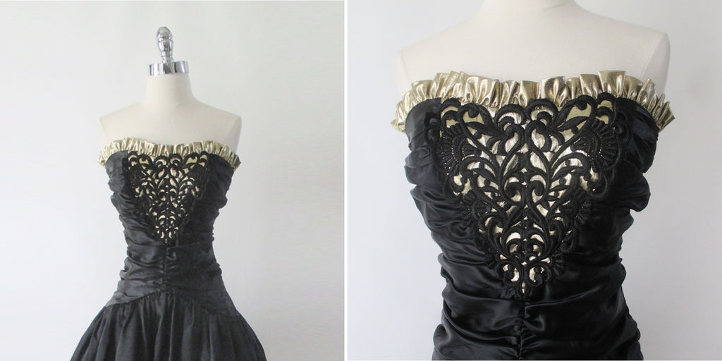 A vintage party dress from the 1980's to 90's in black satin and gold accents.