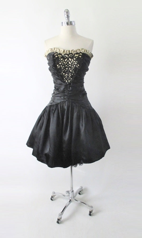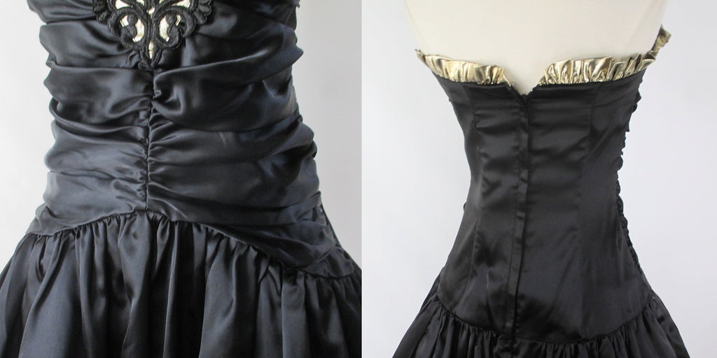 Vintage 80's 90s Strapless Black Satin & Gold Gunne Sax Party Dress XS