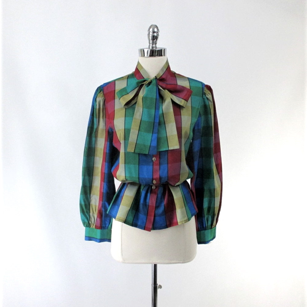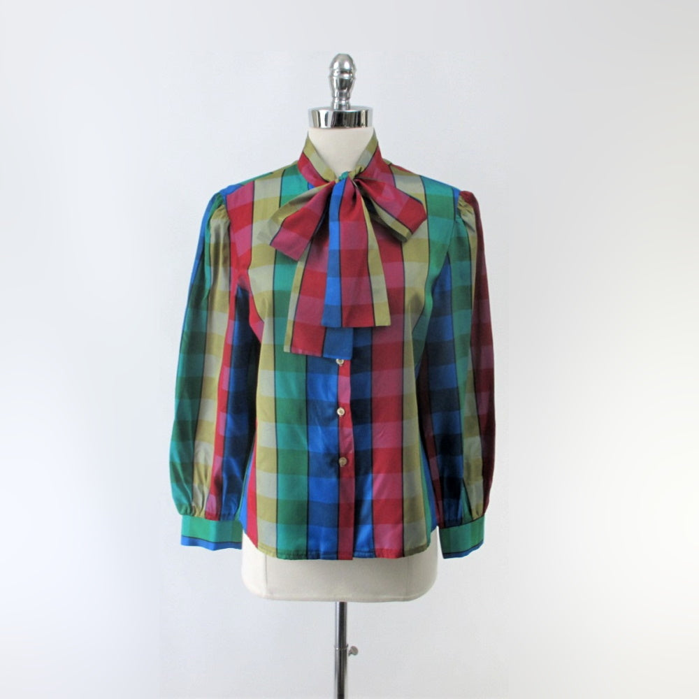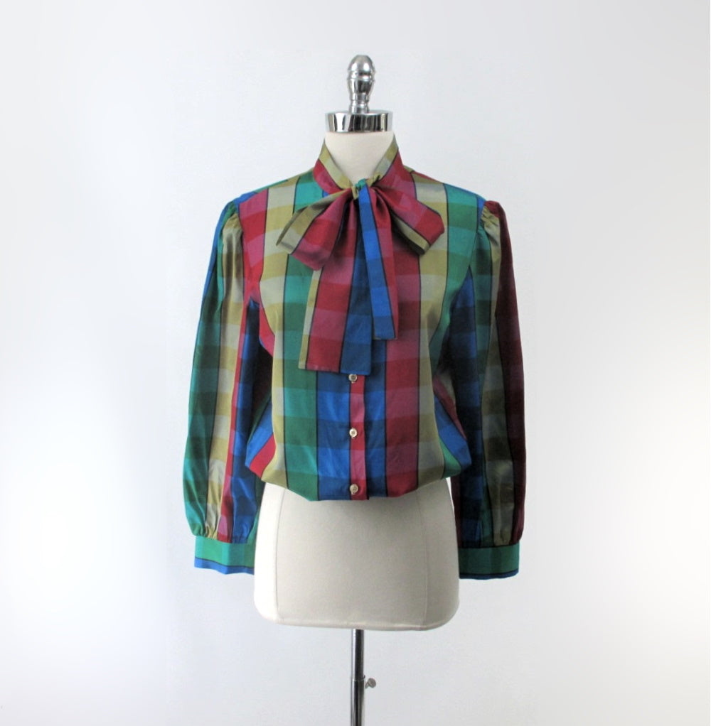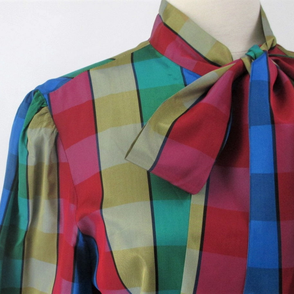 Vintage 70s DVF Diane Von Fürstenberg Pussycat Bow Plaid Blouse L