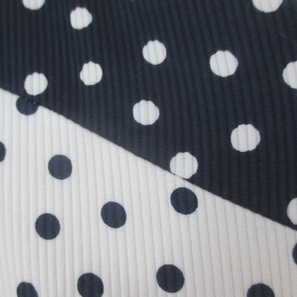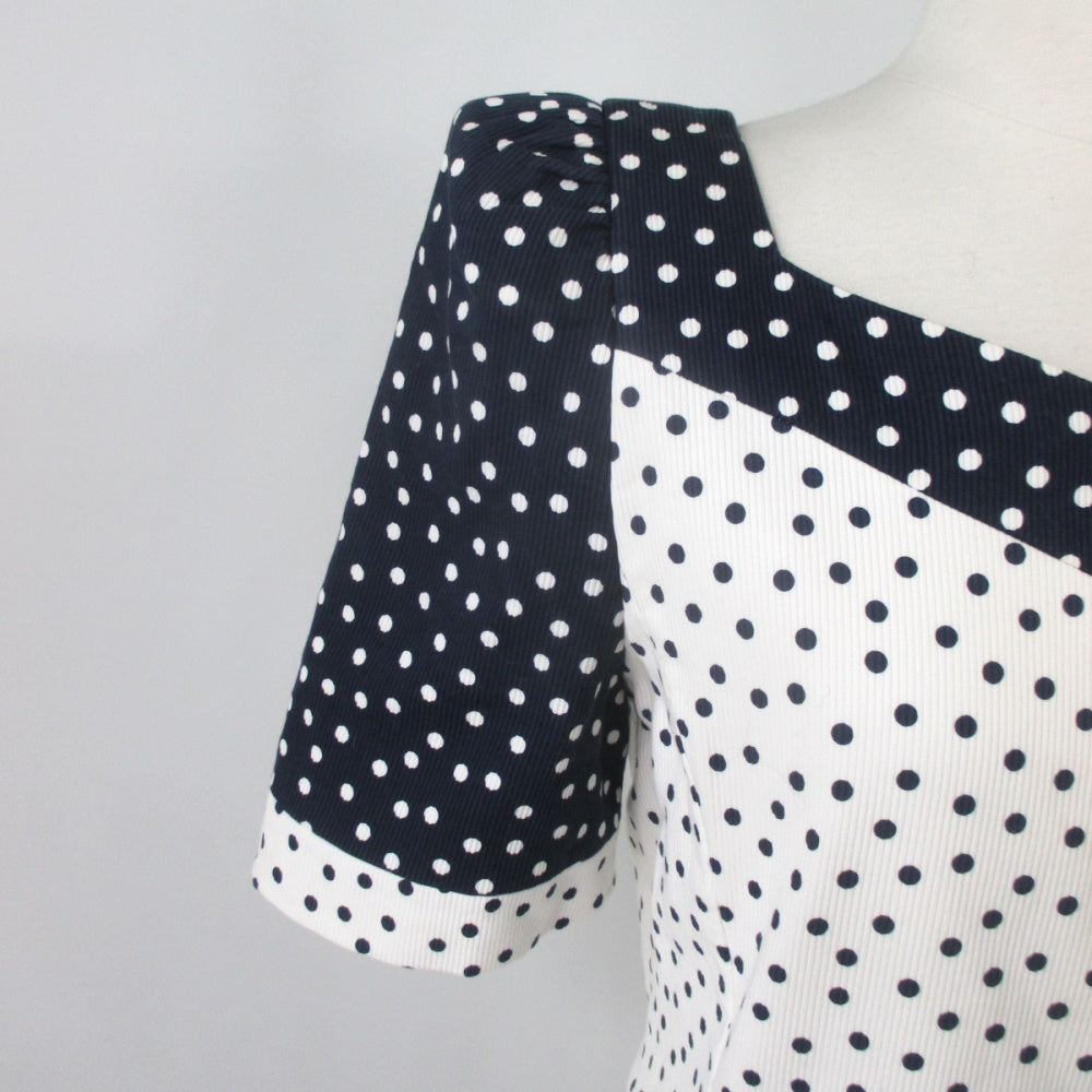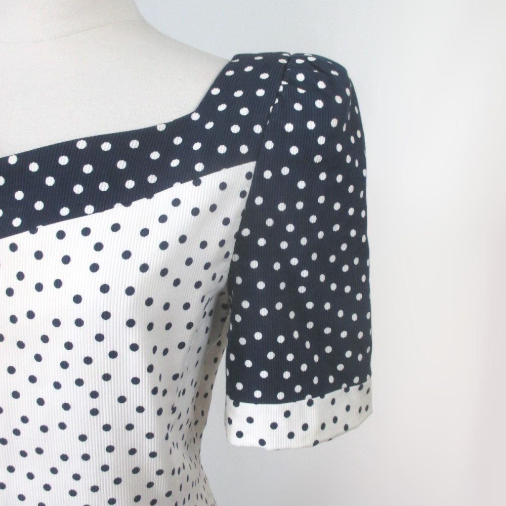 3 point neckline and sleeves with dramatic padded shoulders in navy blue with white polka dots.