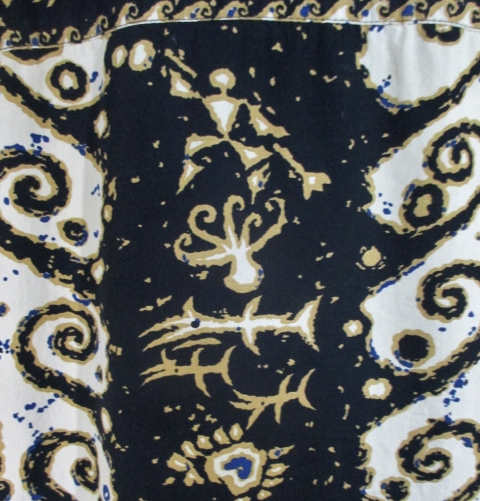 Scrolling design with petroglyphs of hunters, turtles, fish and octopus edged in golden tan and pops of blue.