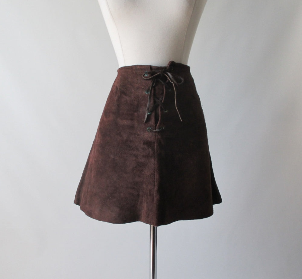 Vintage 60's 70's Brown Suede Leather Lace Front Mini Skirt M