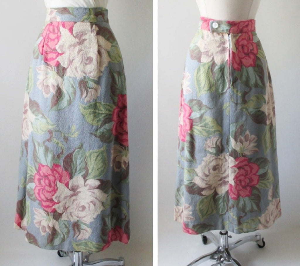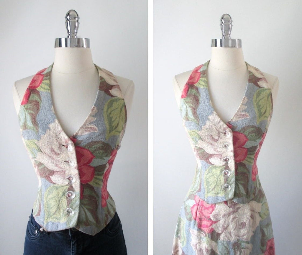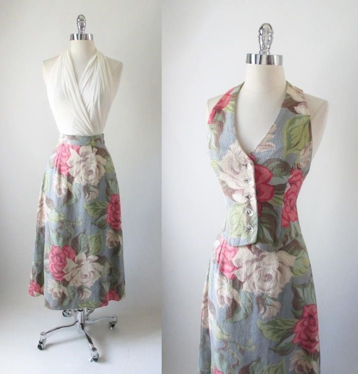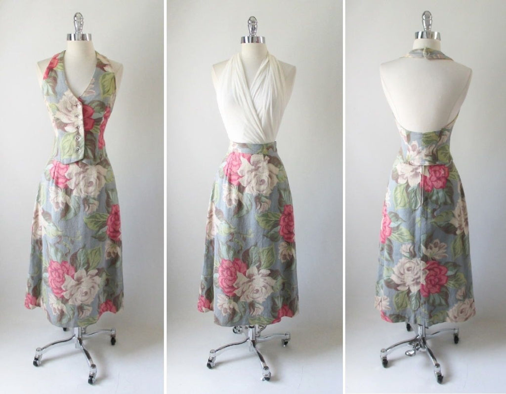 • 40's 70's Roses Barkcloth High Waist Skirt Halter Vest Top Dress 2 Piece Set XS