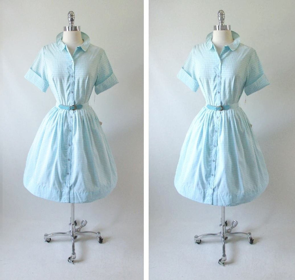 A shirtwaist day dress from the 50's to early 60's in soft blue with
