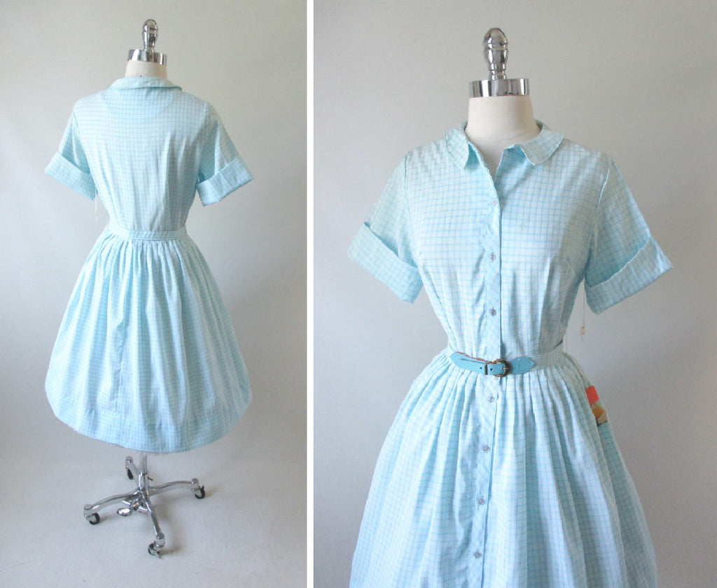 • Vintage 50's 60's Blue Square Full Skirt Shirtwaist Day Dress NOS