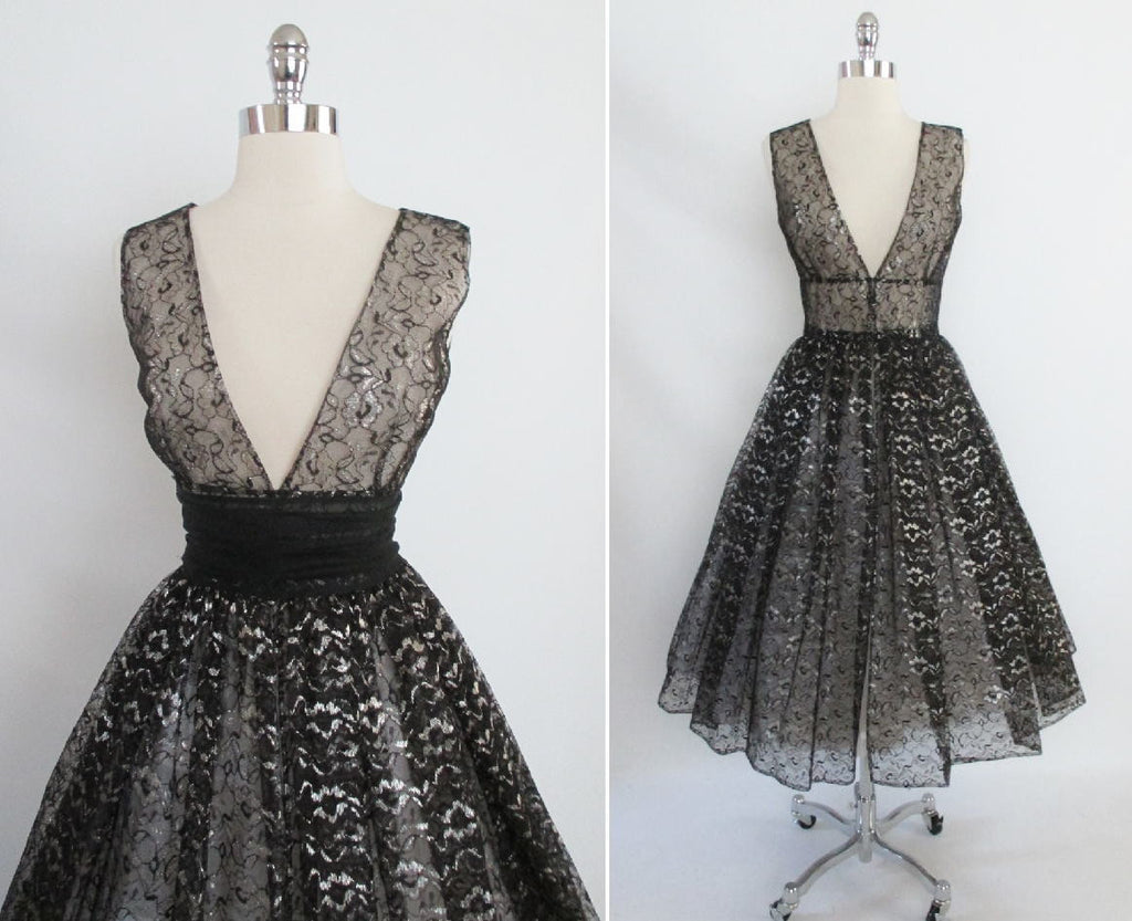 • Vintage 50's Black & Silver Lurex Lace Sheer Full Skirt Party Dress Overskirt S