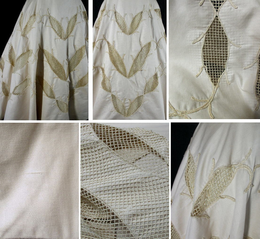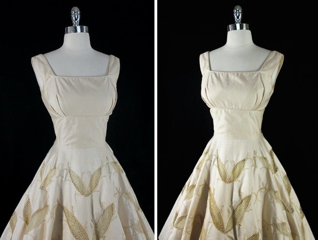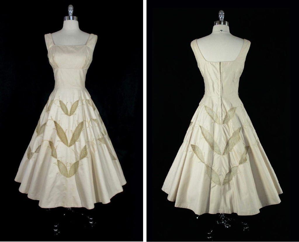 • Vintage 50's Champaign Golden Cut-Out Embroidered Leaves Party Dress S