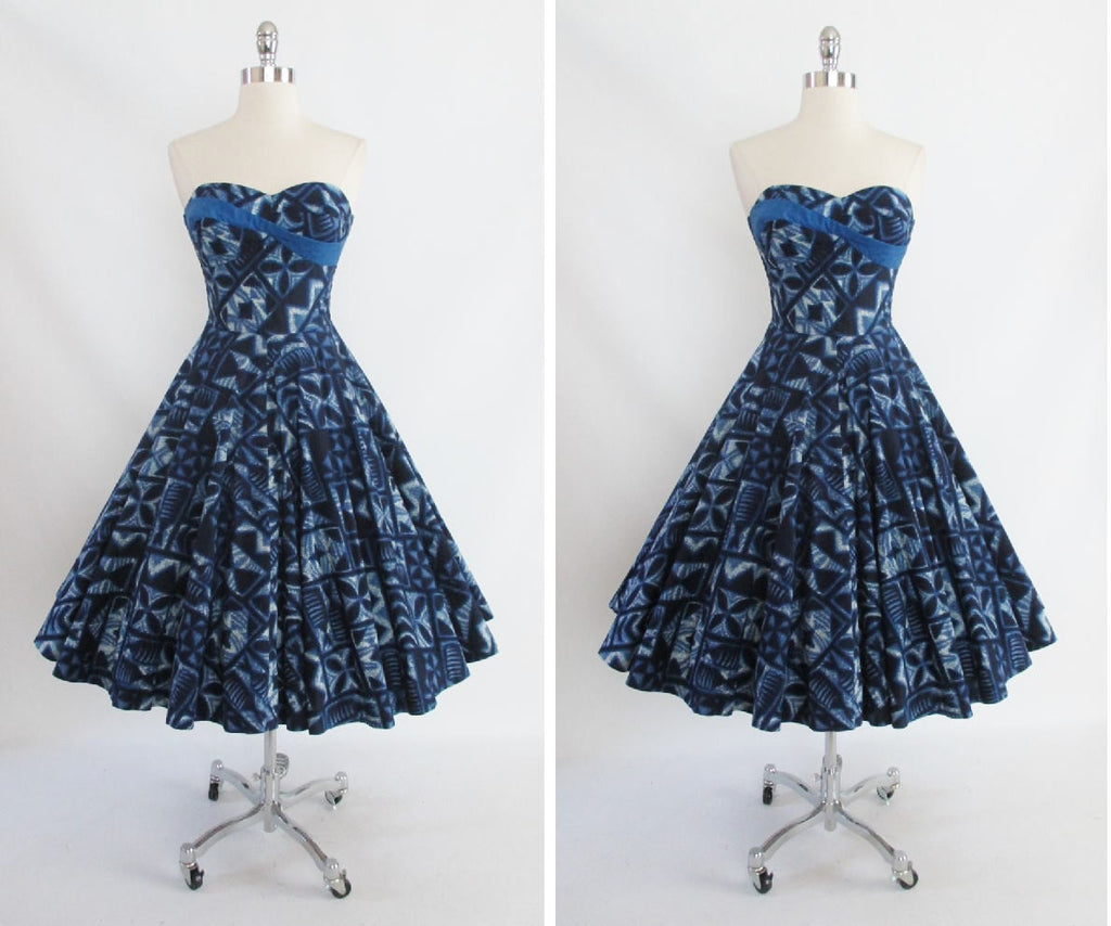 A unique blue Hawaiian dress with a batic block print of flowers and what looks like sushi