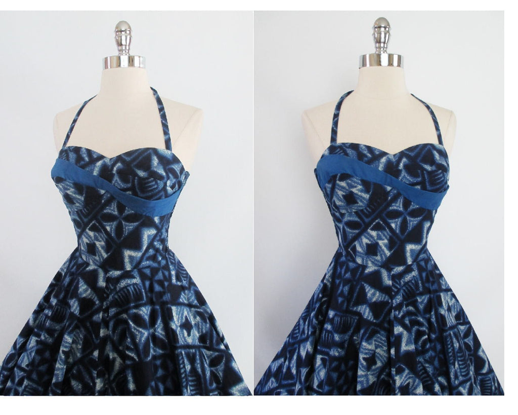 Vintage 50's Lurline Blue Sash Hawaiian Full Swing Skirt Dress S