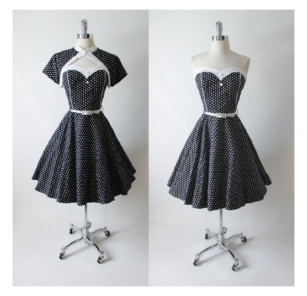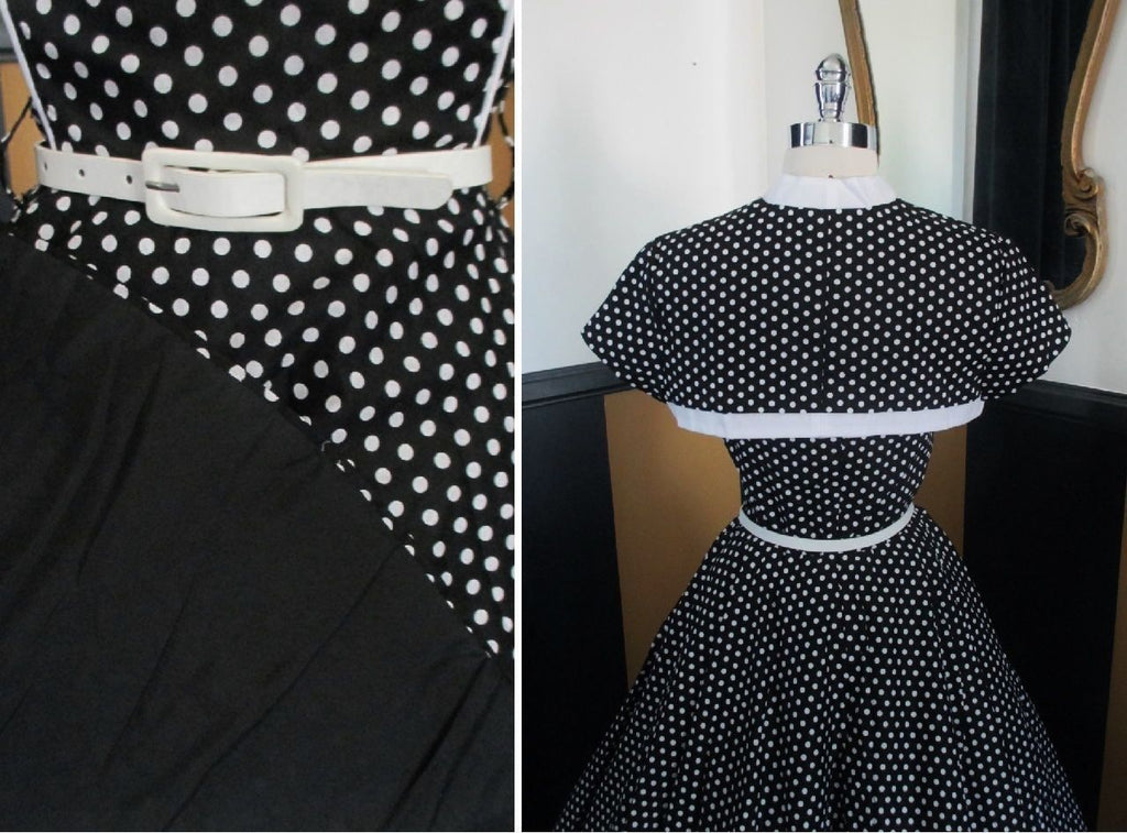 • Vintage 50's Look Strapless Black White Polka Dot Full Circle Skirt Dress & Bolero L