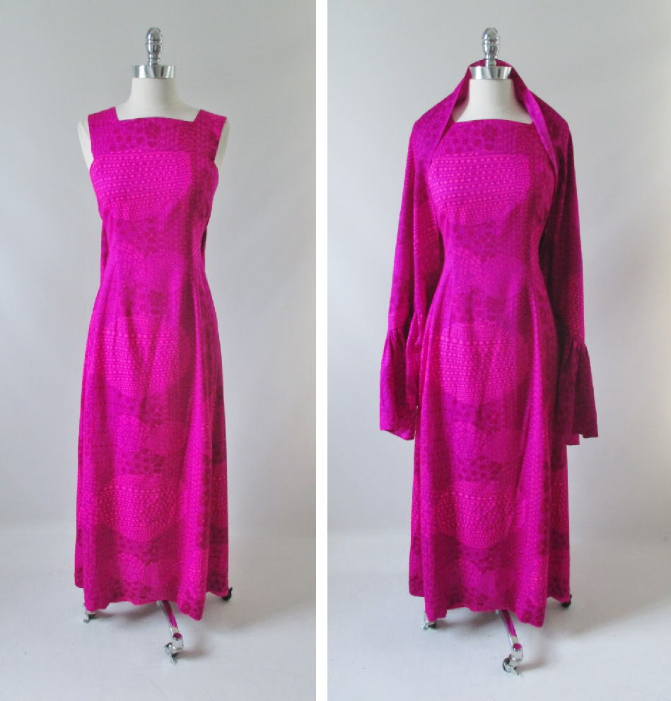 • Vintage 60's 70's Bold Purple Pink Watteau Maxi Dress & Matching Wrap XS