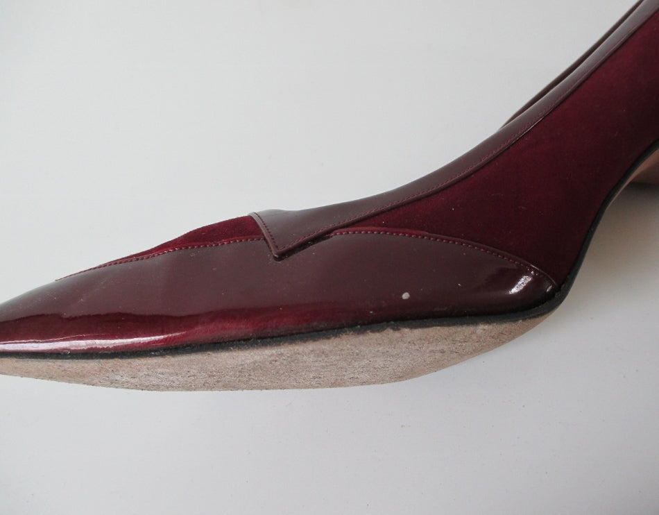 Vintage 60's Deep Red Suede & Patent Leather Pumps Heels Shoes 10.5