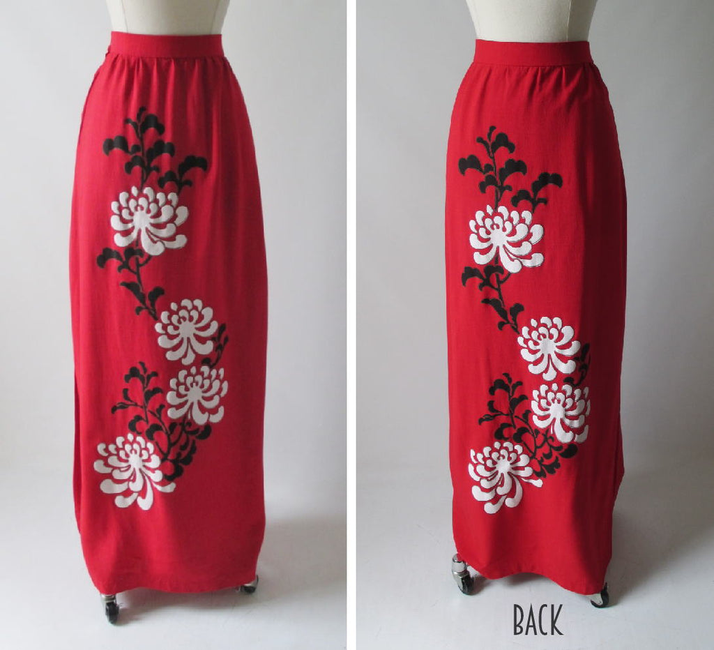 • Vintage 70's Alfred Shaheen Red Linen Long Maxi Skirt L