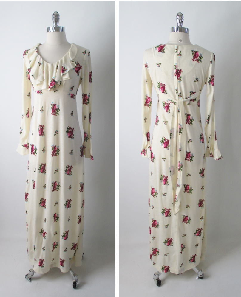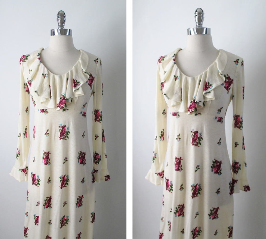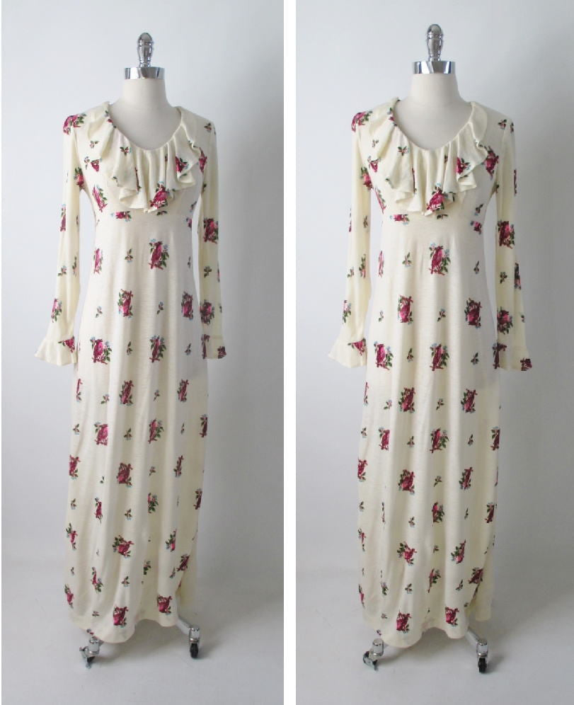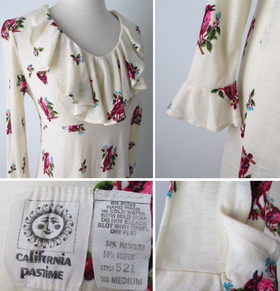 • Vintage 70's Antique White Renn Revival Birds Poet Dress M