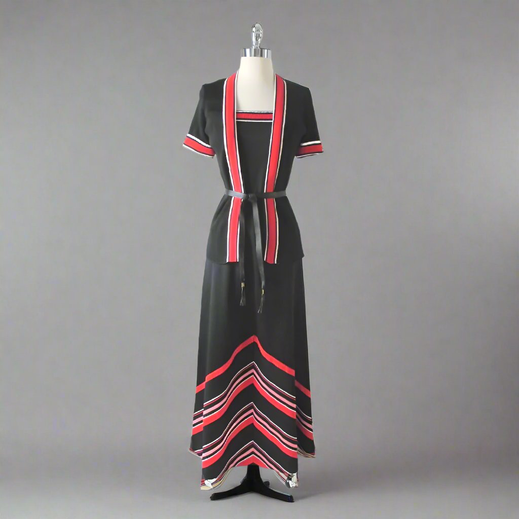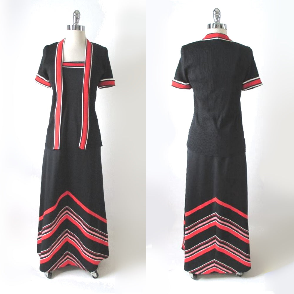 Vintage 70's Chevron Stripe Dress & Sweater / Jacket Set M