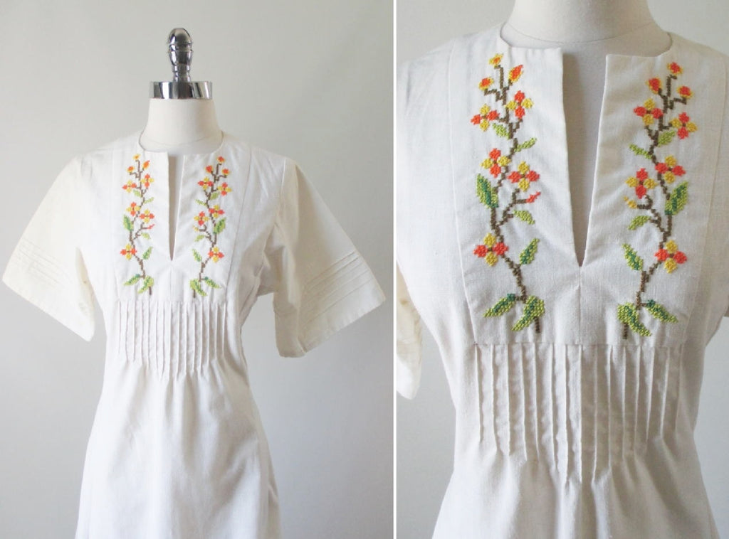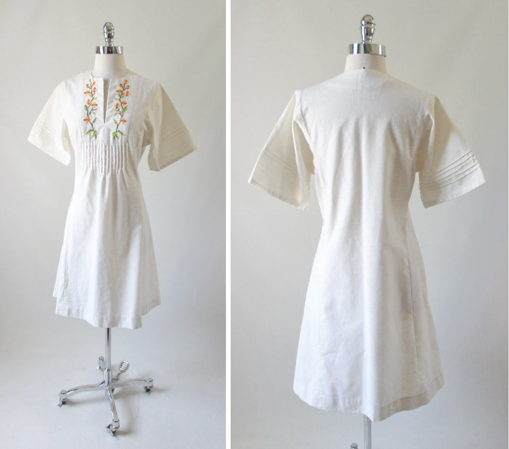 Vintage 70's Cream Embroidered Pleated Tunic Dress