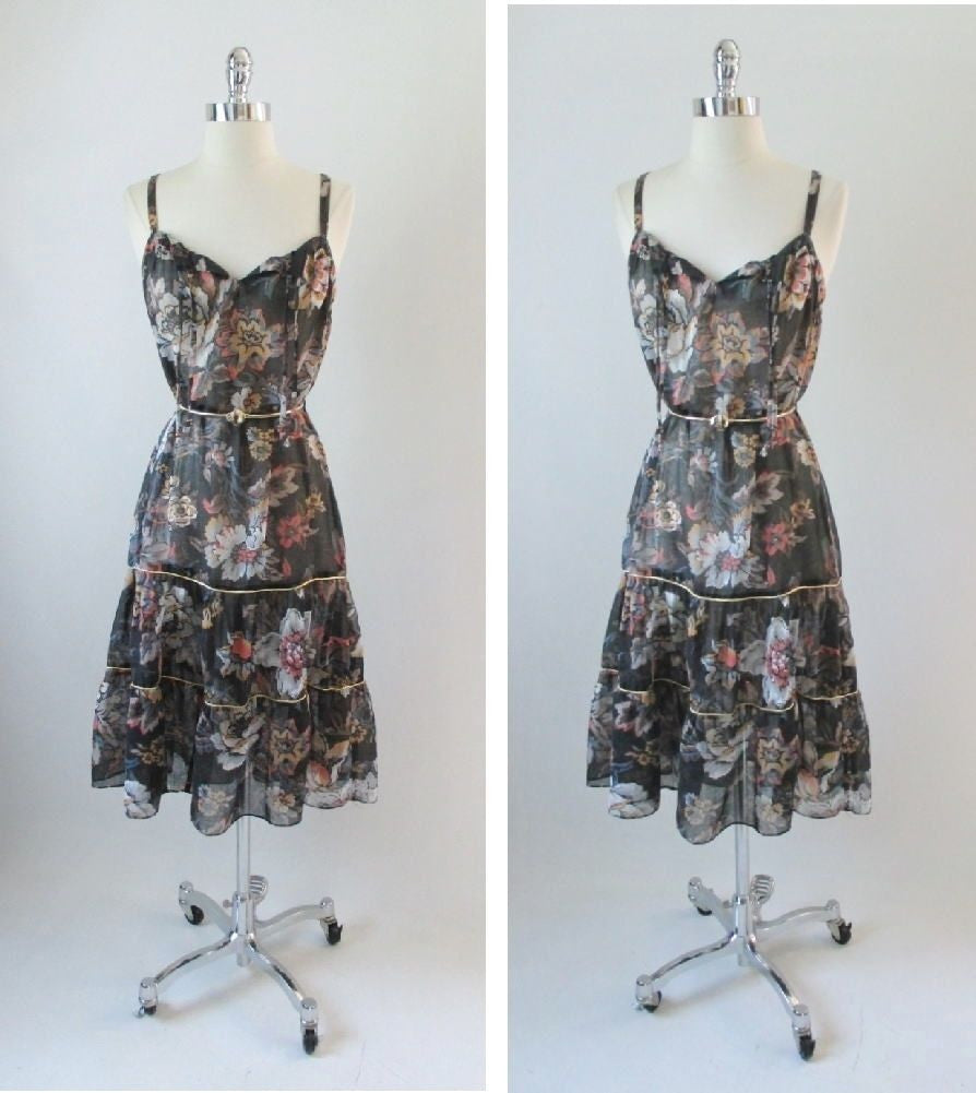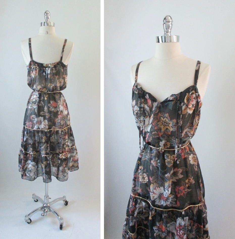 • Vintage 70's Sheer Black Tapestry Flower Summer Sun Dress M