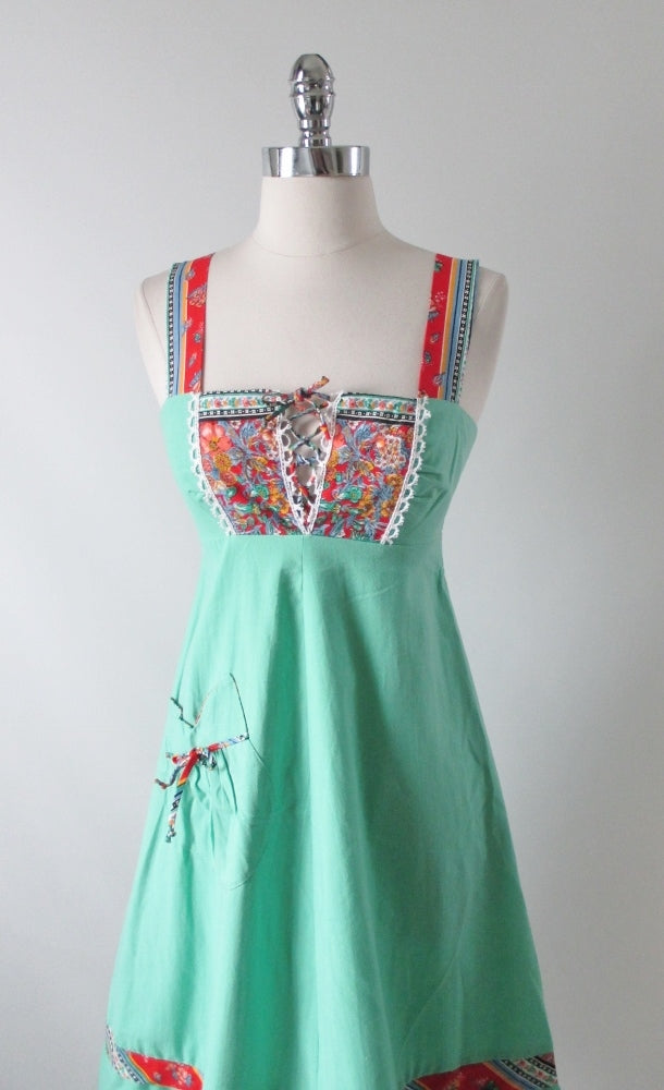 Vintage 70's Green Lace Up Flower Hippie Dress XXS