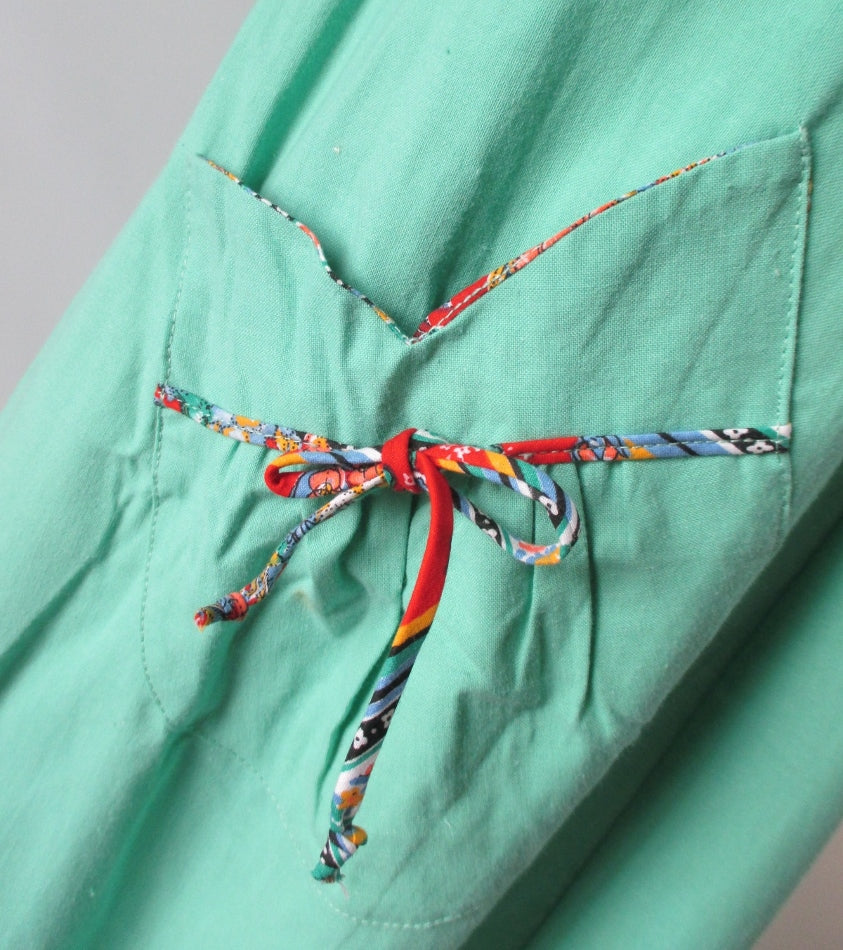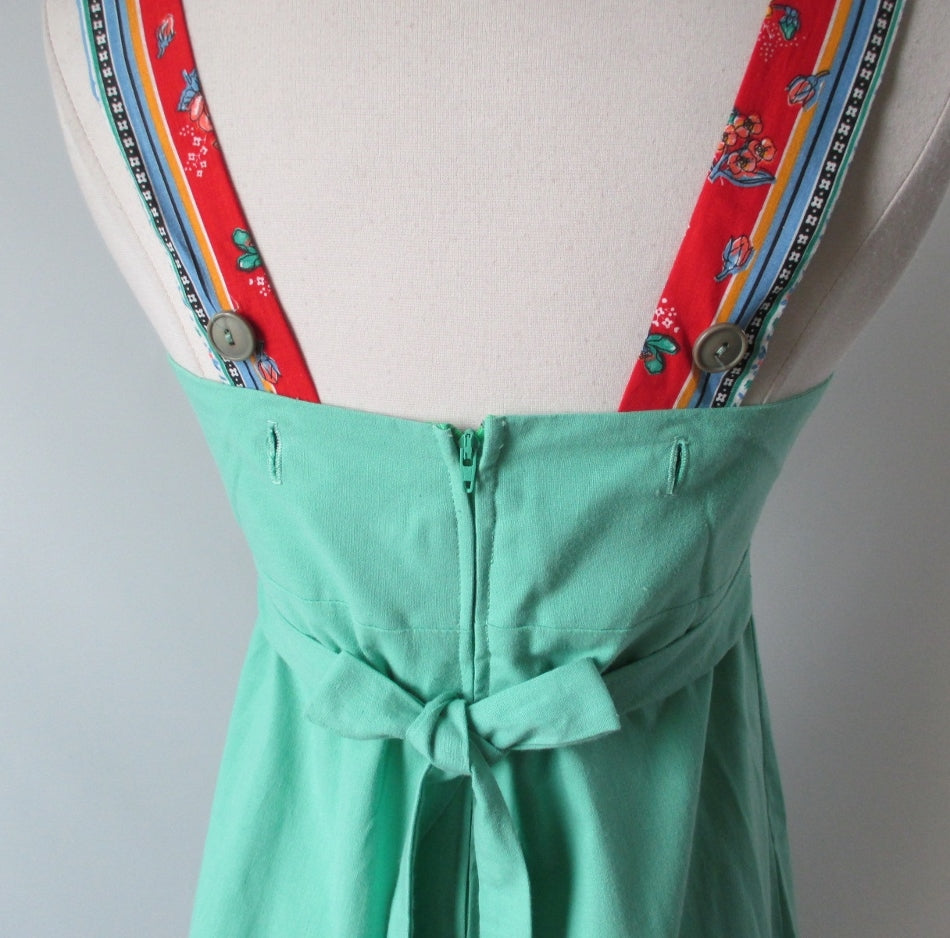 Mint green cotton accented with straps and trim in a floral fabric