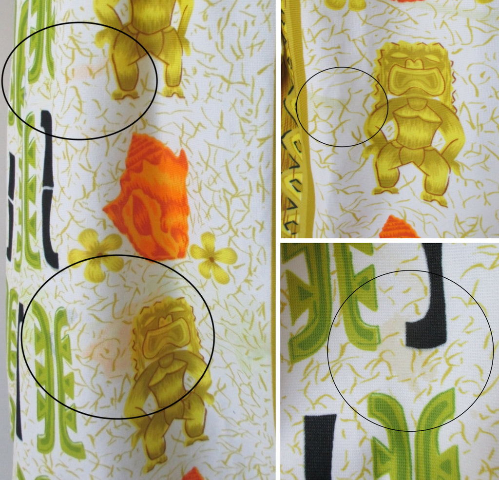 Soft white poly with pineapples and tiki gods in yellow, orange and black