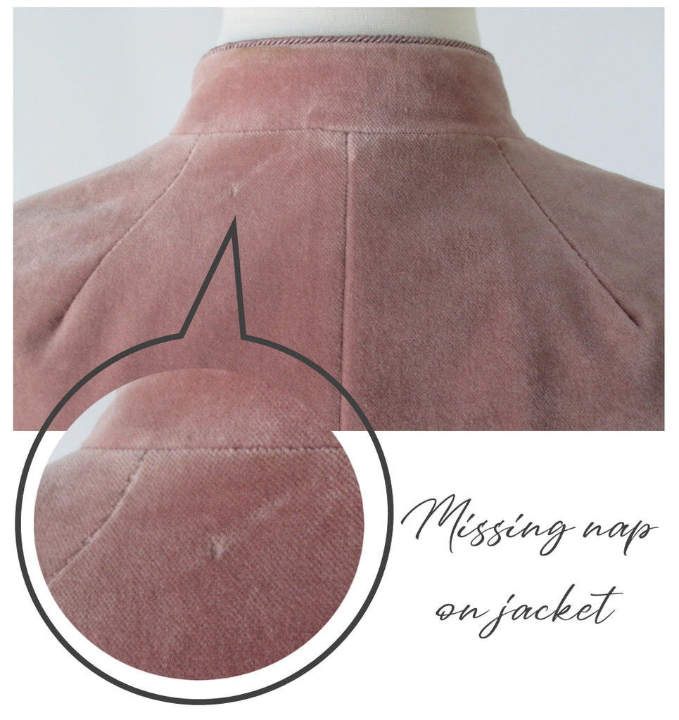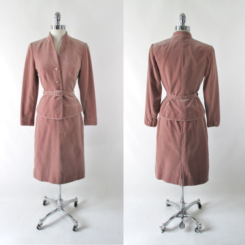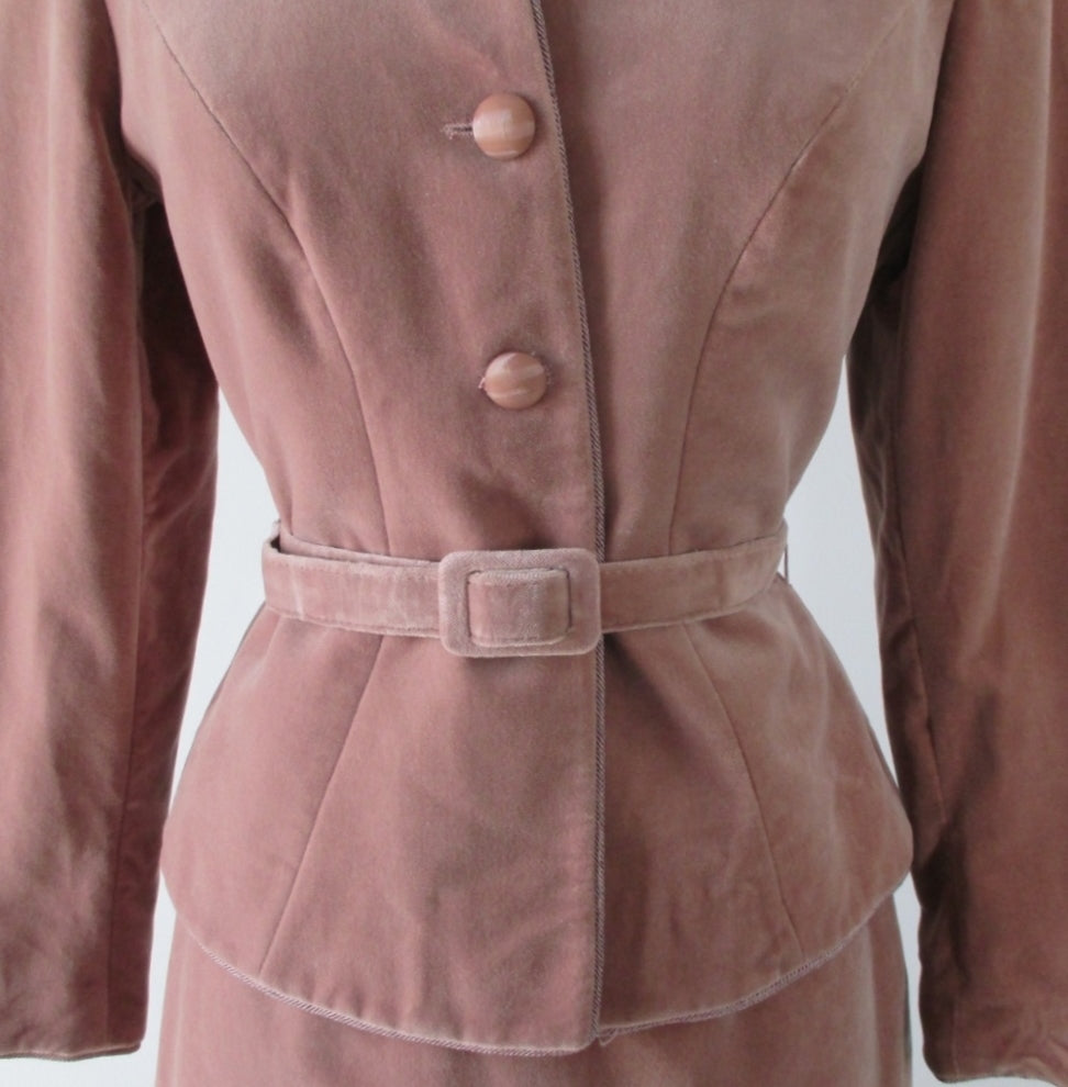 3 piece suit in muted / dusty pink soft velour edged with silvery-purple piping.