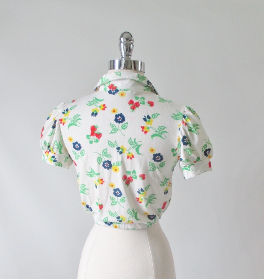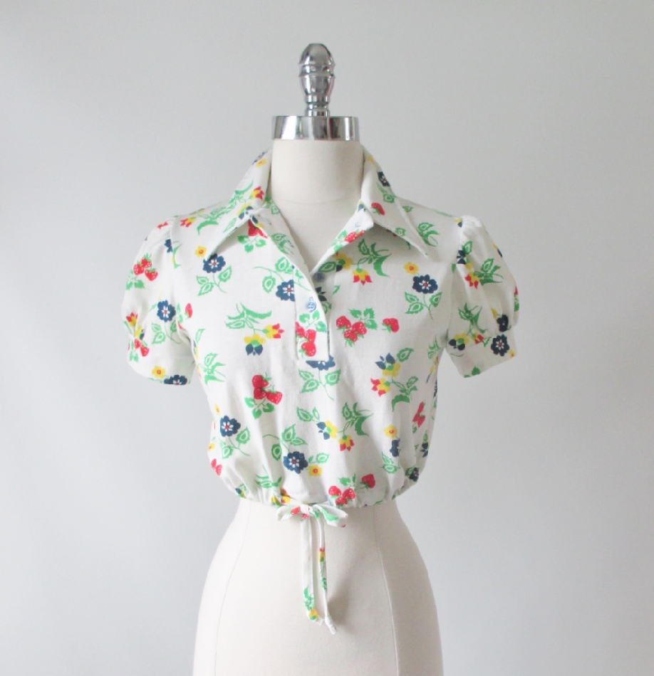 • Vintage 70's Puff Sleeve Strawberry Blouse Top S