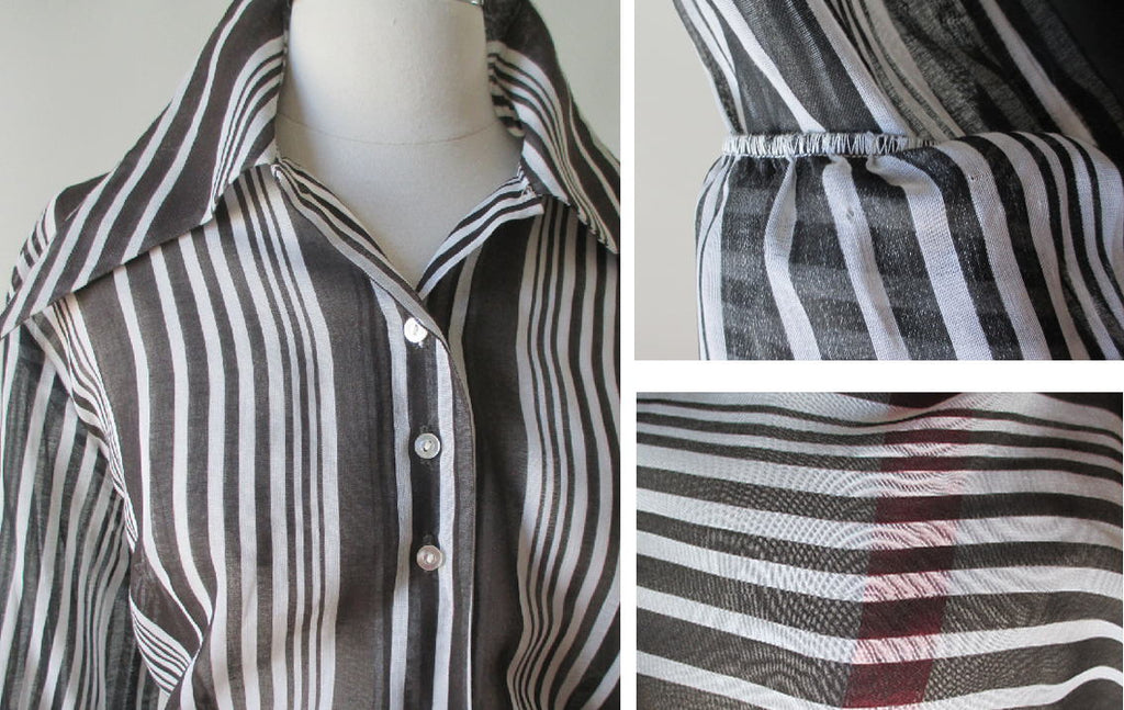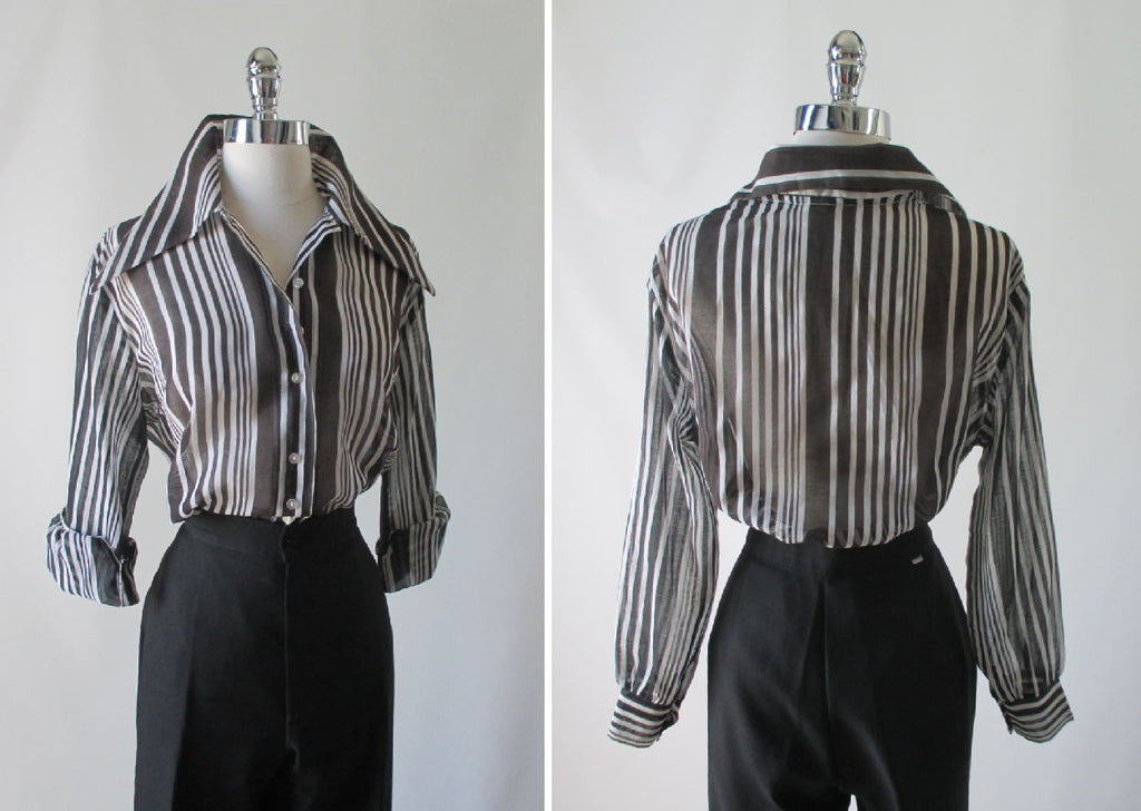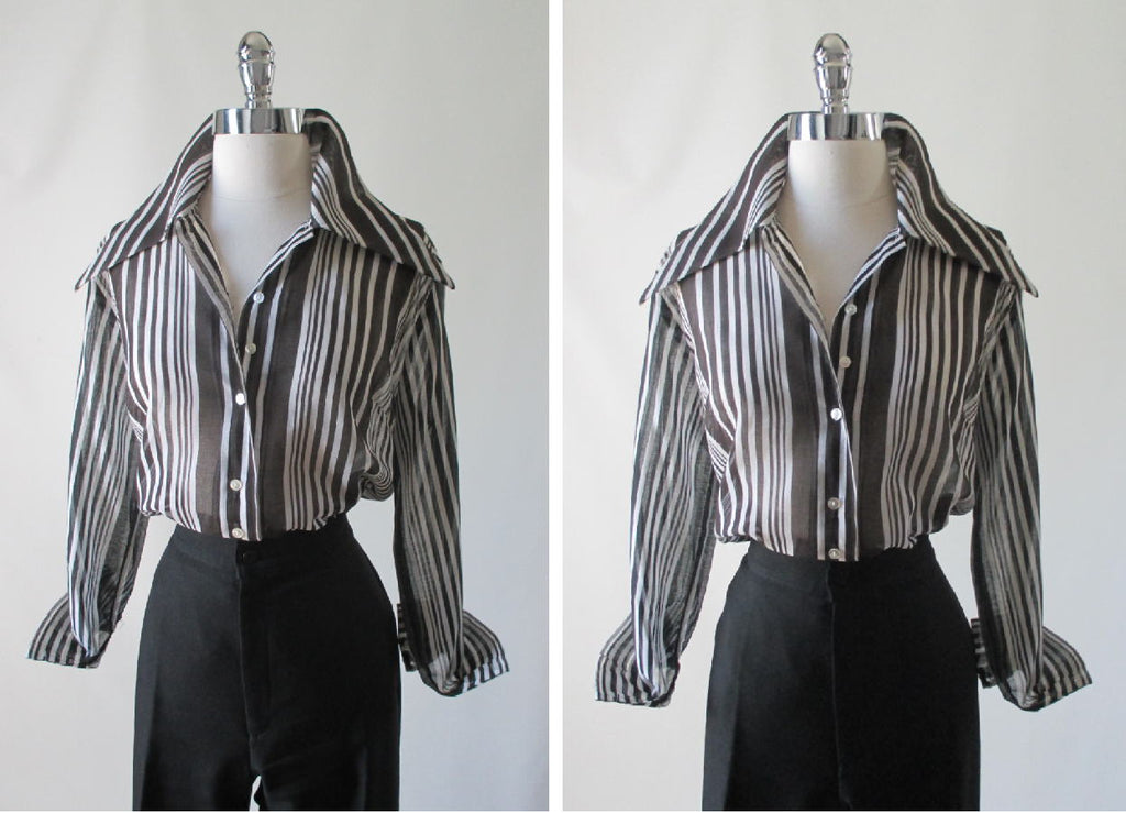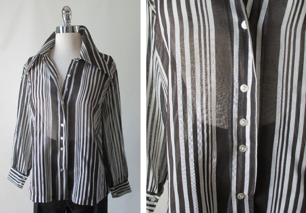 • Vintage 70's Sheer Black White Blouse Top Wide Collar Classic Shirt L